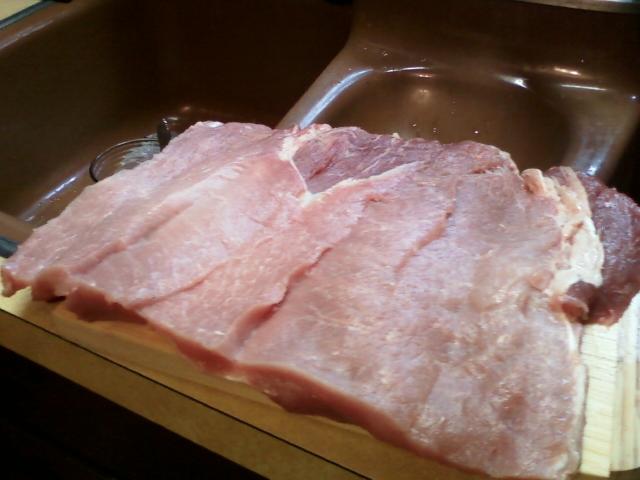 a roll cut. Holding the knife parallel to the cutting board and starting at the bottom of the roast make a lengthwise cut, cutting almost to the other side. Unfold the top of the roast ( kind of like unrolling a roll of paper towels on it’s side). Continue to cut and unroll. You should end up with a large rectangle of meat that is about 1/2 inch thick. You can use a rolling-pin or a meat pounder to flatten out any bumps or thick spots.