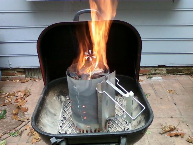 Start your coals. Wood chunks can go on top of the pile or in the top of the chimney starter.