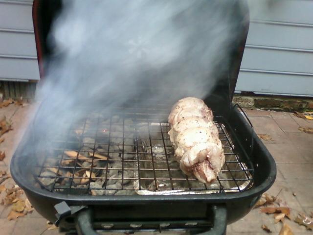 The roast is cooked using indirect heat. Heat the coals to medium high and rake to one side or make a pile on each side of the grill. Use a drip pain under the roast. Clean and oil the grate. Place the roast over the drip pan fat side up and close the lid. Remember to add wood chips on top of your charcoal. As the meat is grilling you can add more chips later.