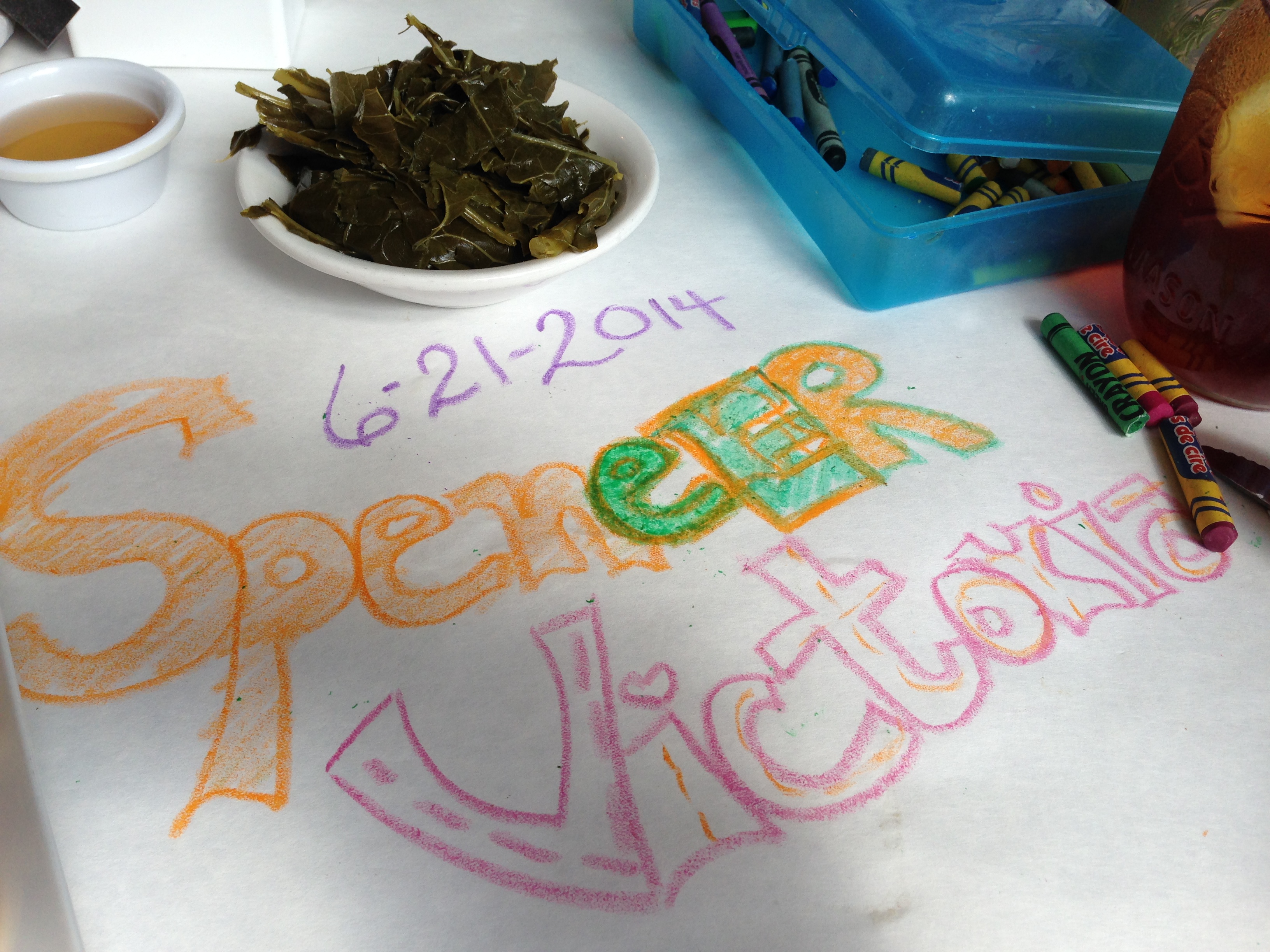 I’m so distracted, I spell Spencer’s name wrong (the future groom) and have to creatively correct my error. While coloring, I notice the delicate plates and southern patterns.