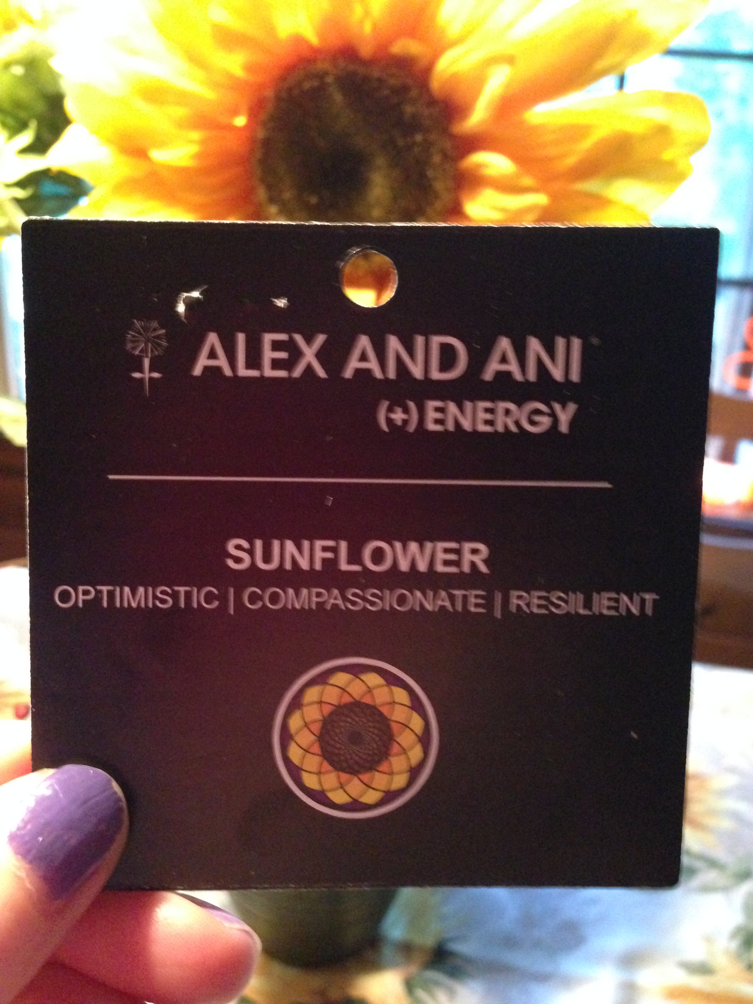 The tag with the sunflower bracelet symbolizes optimism, compassion, and resilience.
