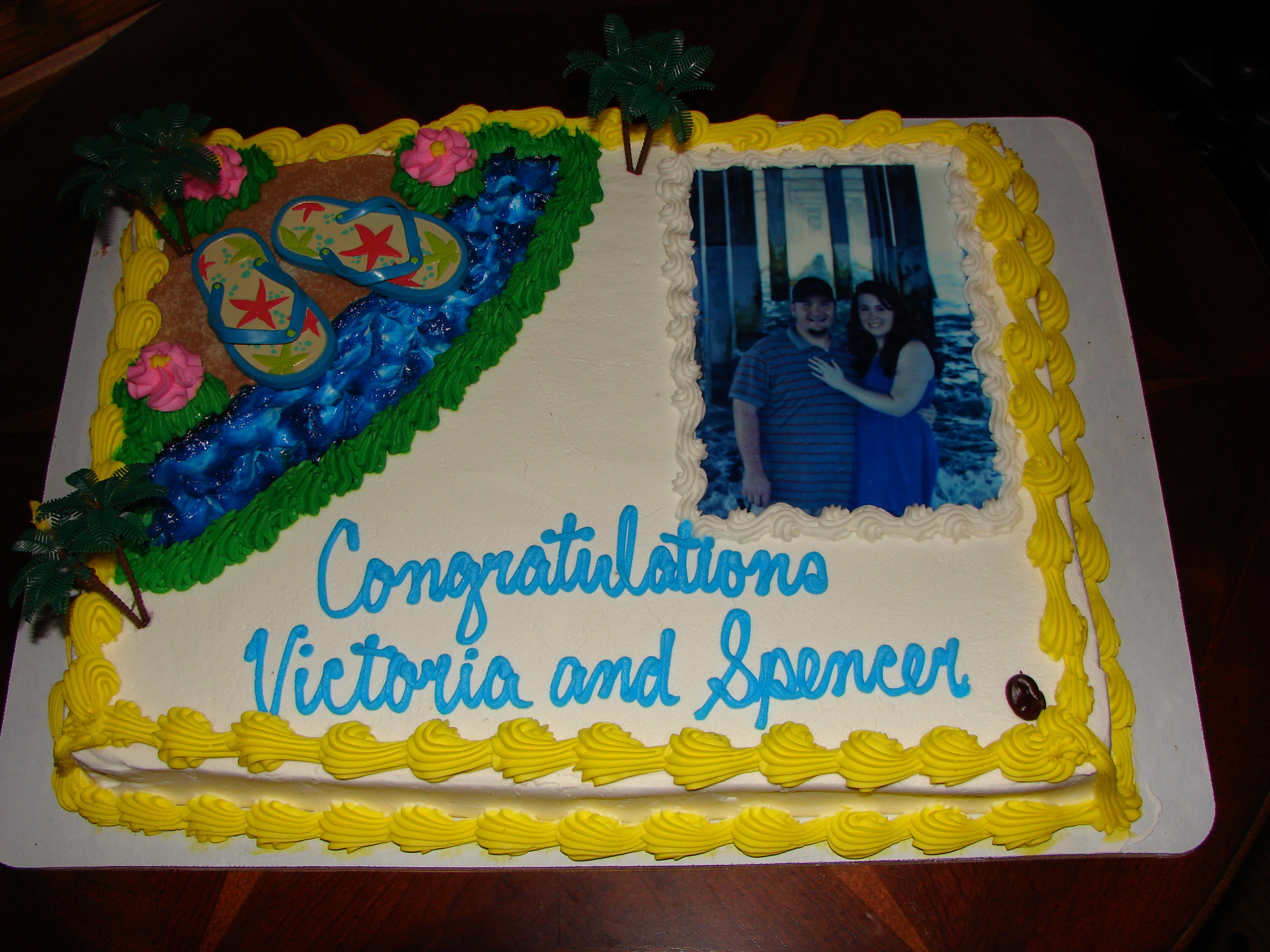 Ask the bride her favorite main dish and ask others to bring side dishes. On the invitation we shared the main dish of Huli Huli Chicken and Hawaiian Macaroni. Using Facebook invite we kept a running list of who was bringing what for variety. The groom’s mother brought some of his favorites and the cake with a great picture of them on the cake. Most places can actually put the picture made with icing on a cake!