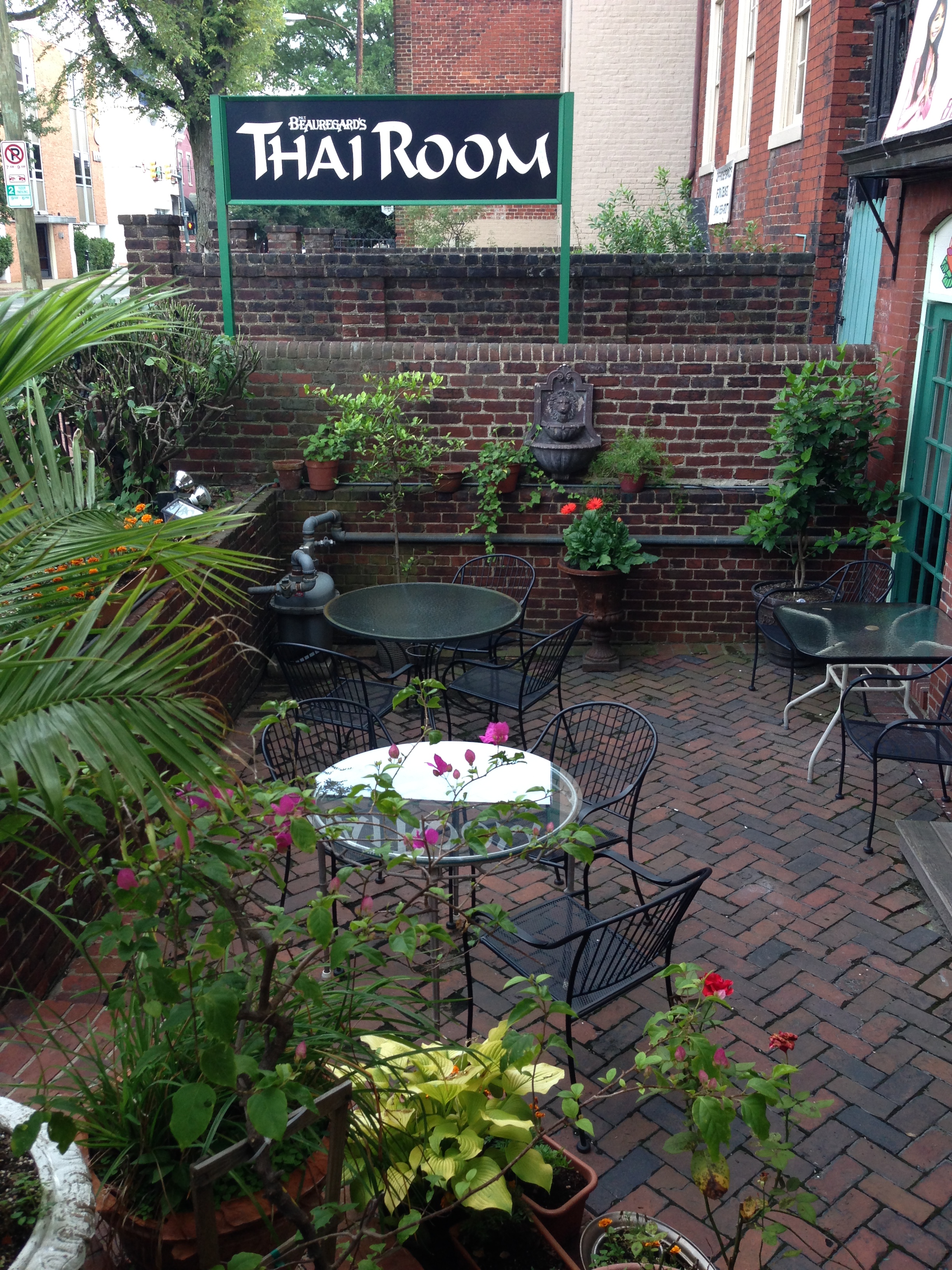 Beauregard’s is located on 103 East Cary Street in Richmond, Virginia. The historical building was originally the Munford Home, circa 1870. This authentic and beautiful Thai cuisine restaurant has an upstairs that seats 150 for lunch and dinner. What we love most is the outdoor seating that is romantically decorated with street lights, flowers, and a koi fountain. They have a back patio and a courtyard setting in the front of the restaurant. We sat at a table with an umbrella and found the patio to be shady and cool in the summer.