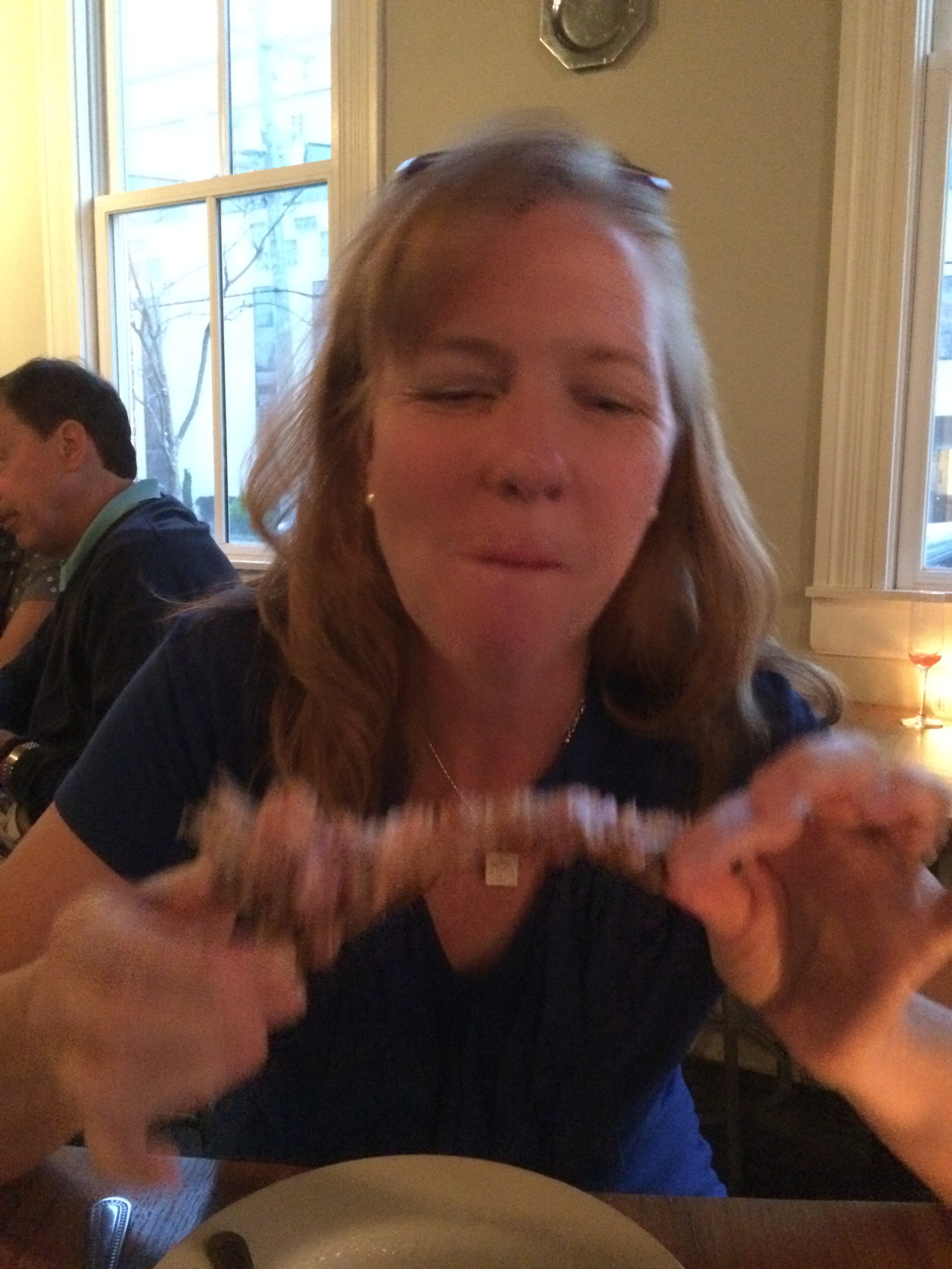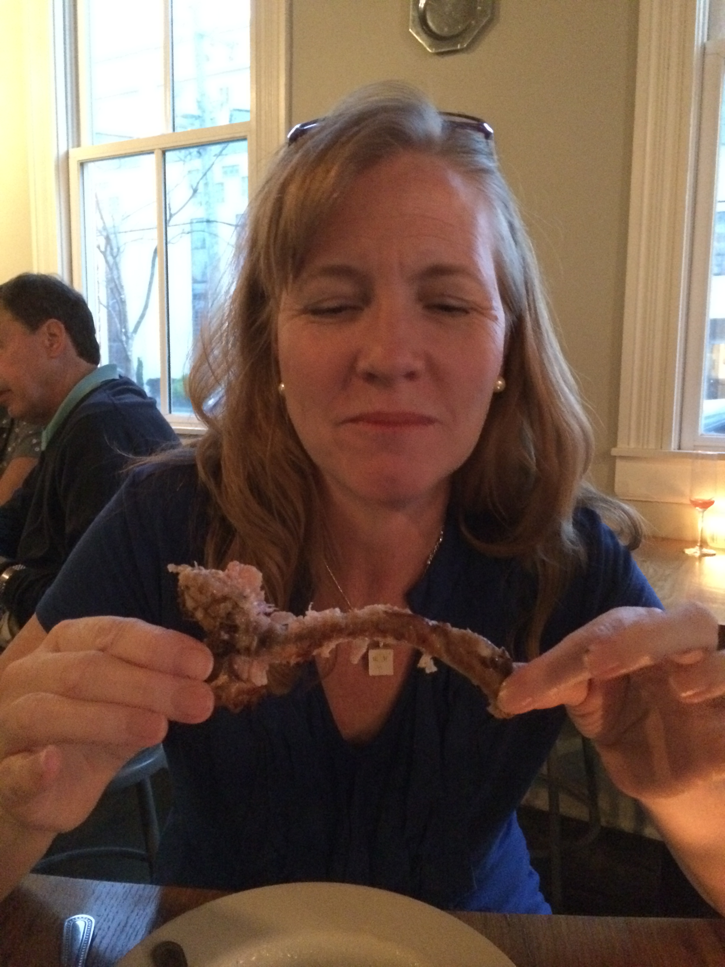 There are some things you should not do out in public–just bad table manners, but I could not help myself. The pork chop was so tasty, I just had to —