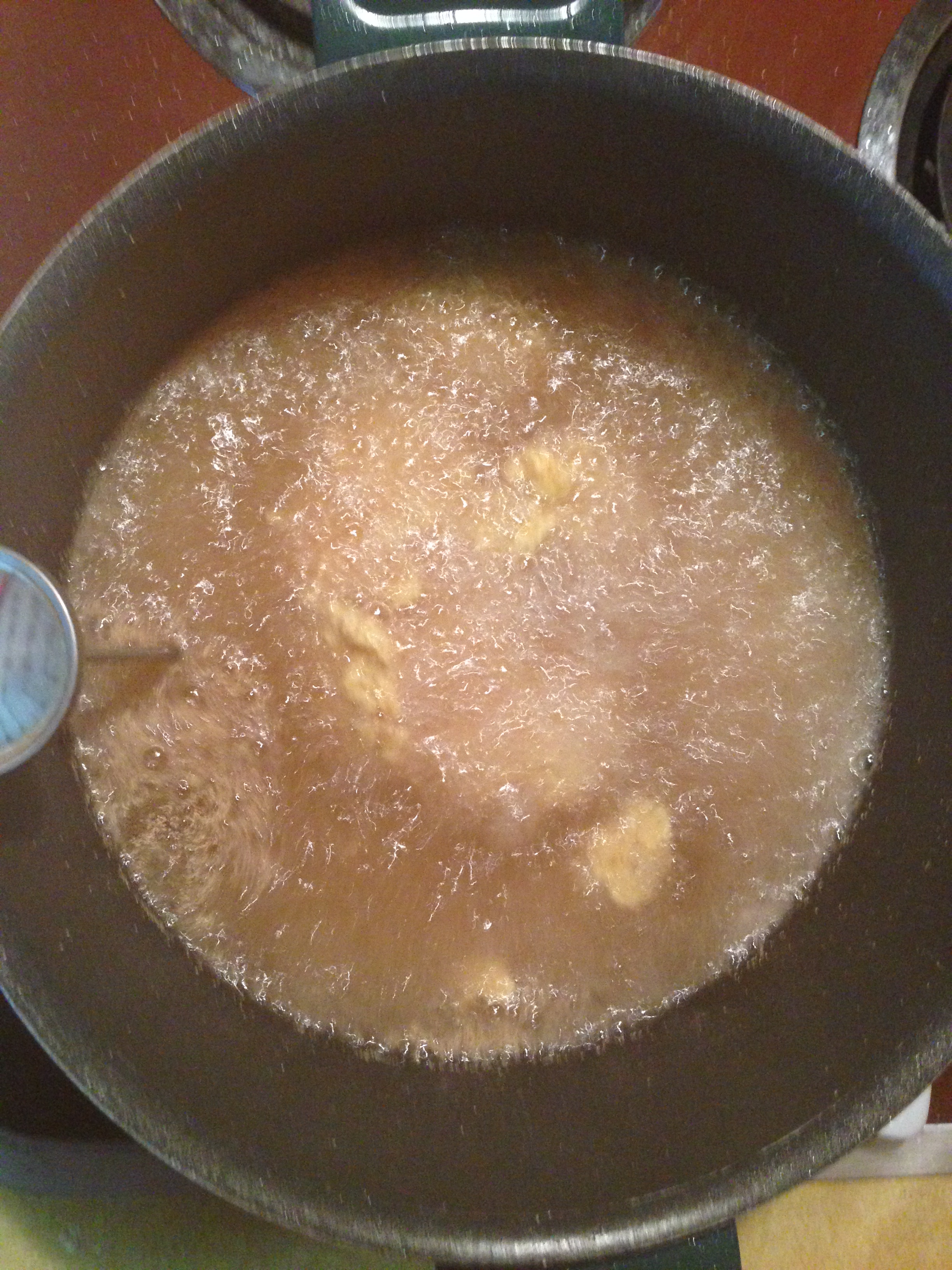 In a medium heavy-bottomed saucepan with high sides, heat oil to 350 degrees on a deep-fry thermometer.