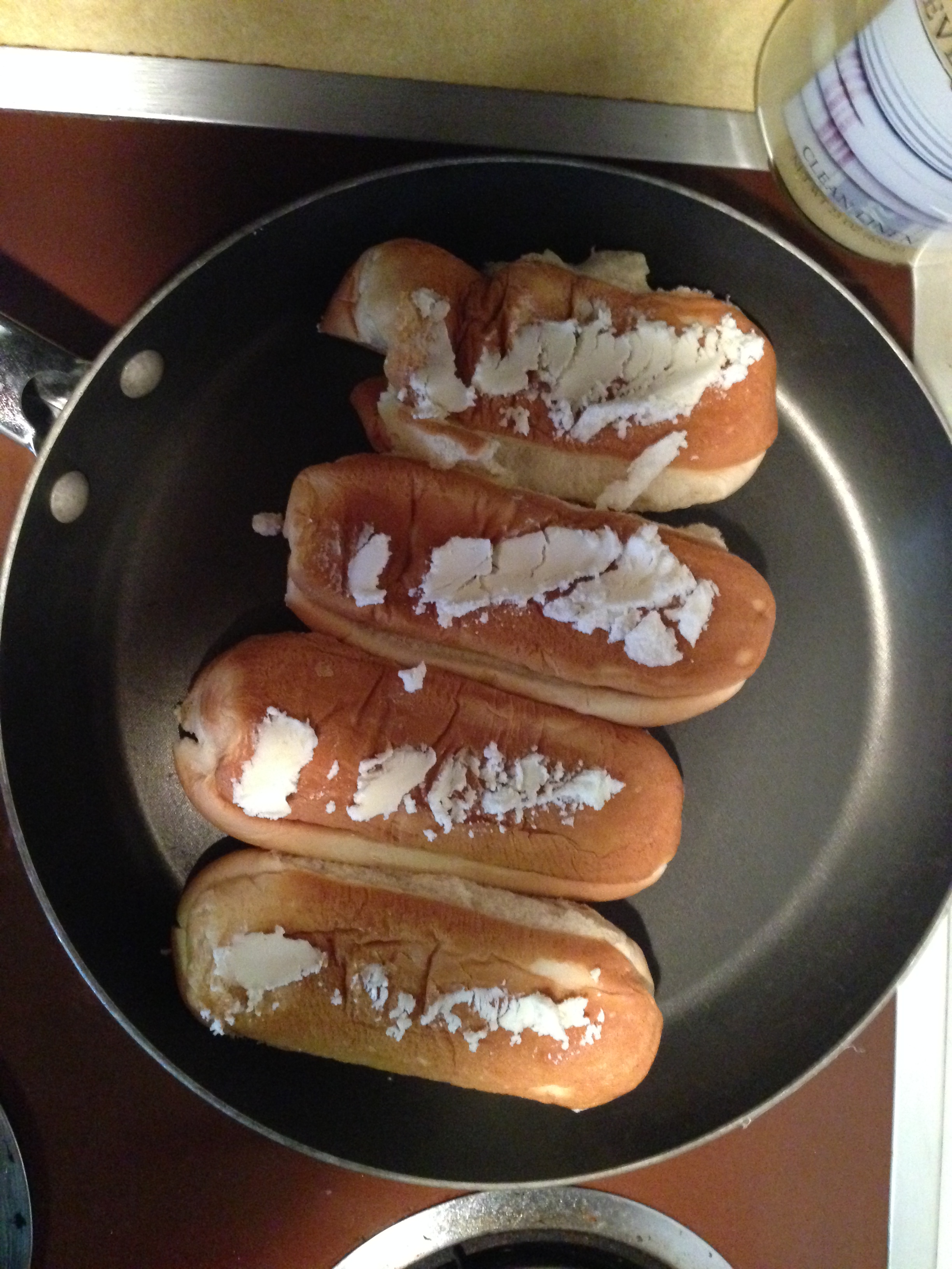- Meanwhile, heat a large skillet over medium heat. Spread butter on both sides of hot dog buns and place in the skillet on their sides, turning, until evenly browned.