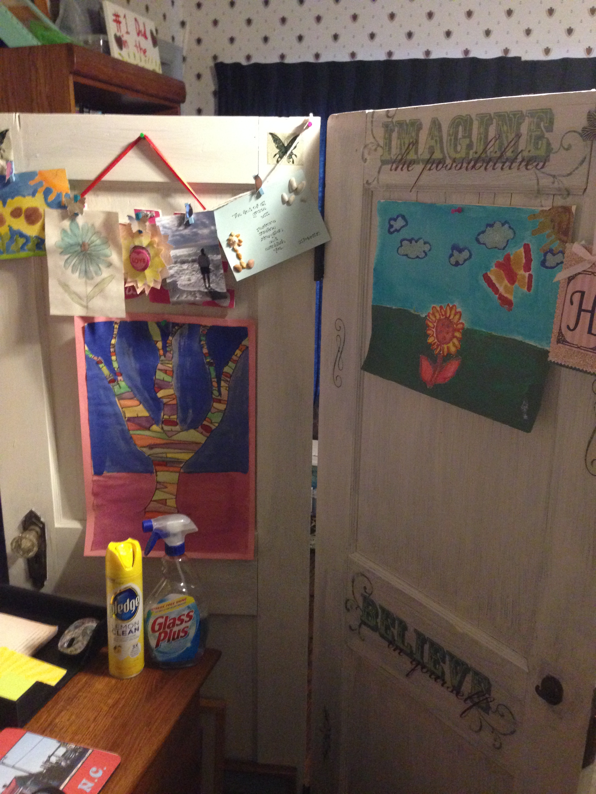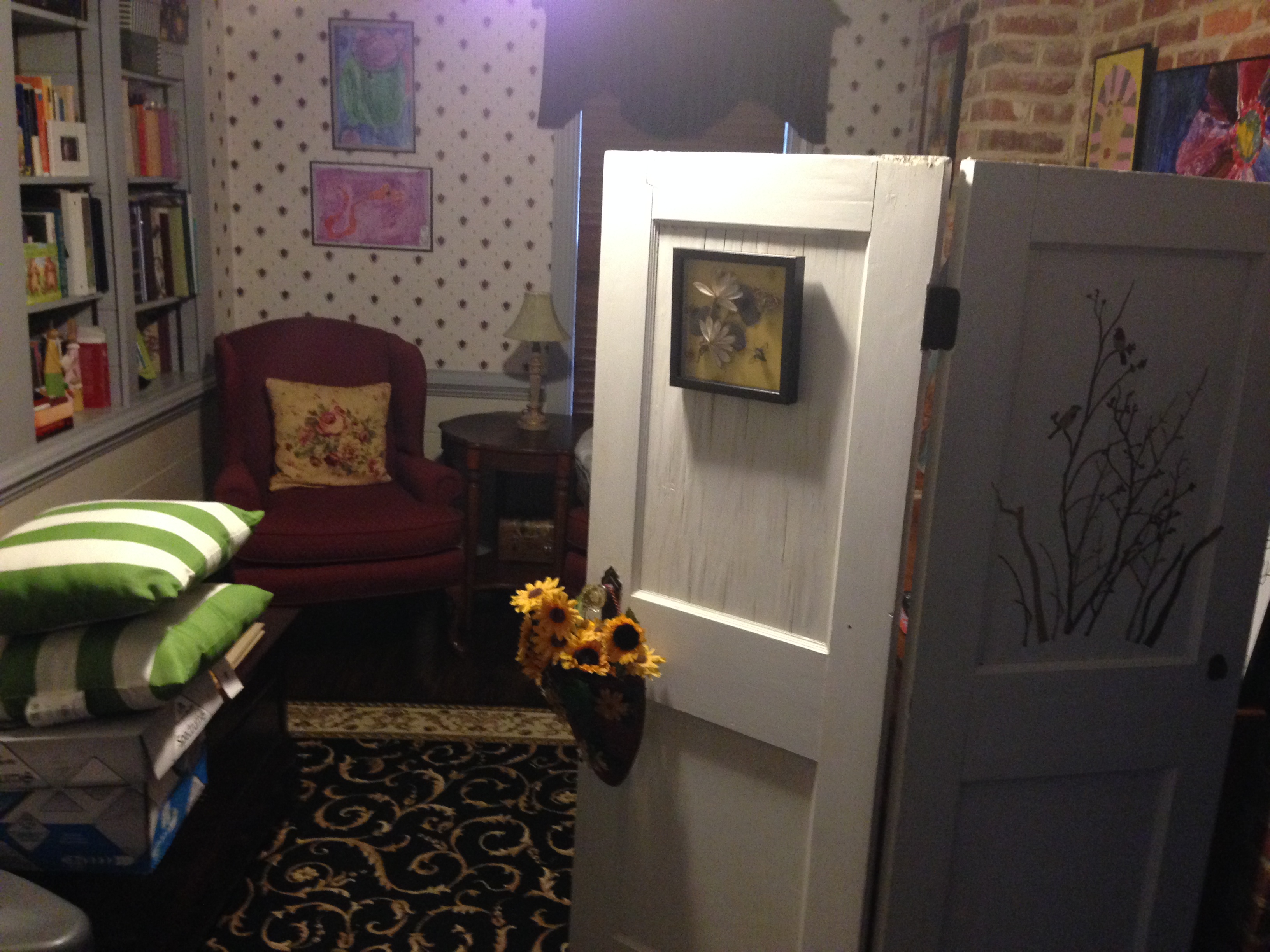 My husband took two old doors from my grandmother’s house, painted them, and hinged them together to make me a divider for privacy. This is a busy part of the house for going outside, and the pathway to grandma’s and papa’s house. It’s also on the way to the laundry room. I’m not sure how the traffic is going to do, and we may actually build a more secluded spot utilizing a wall.