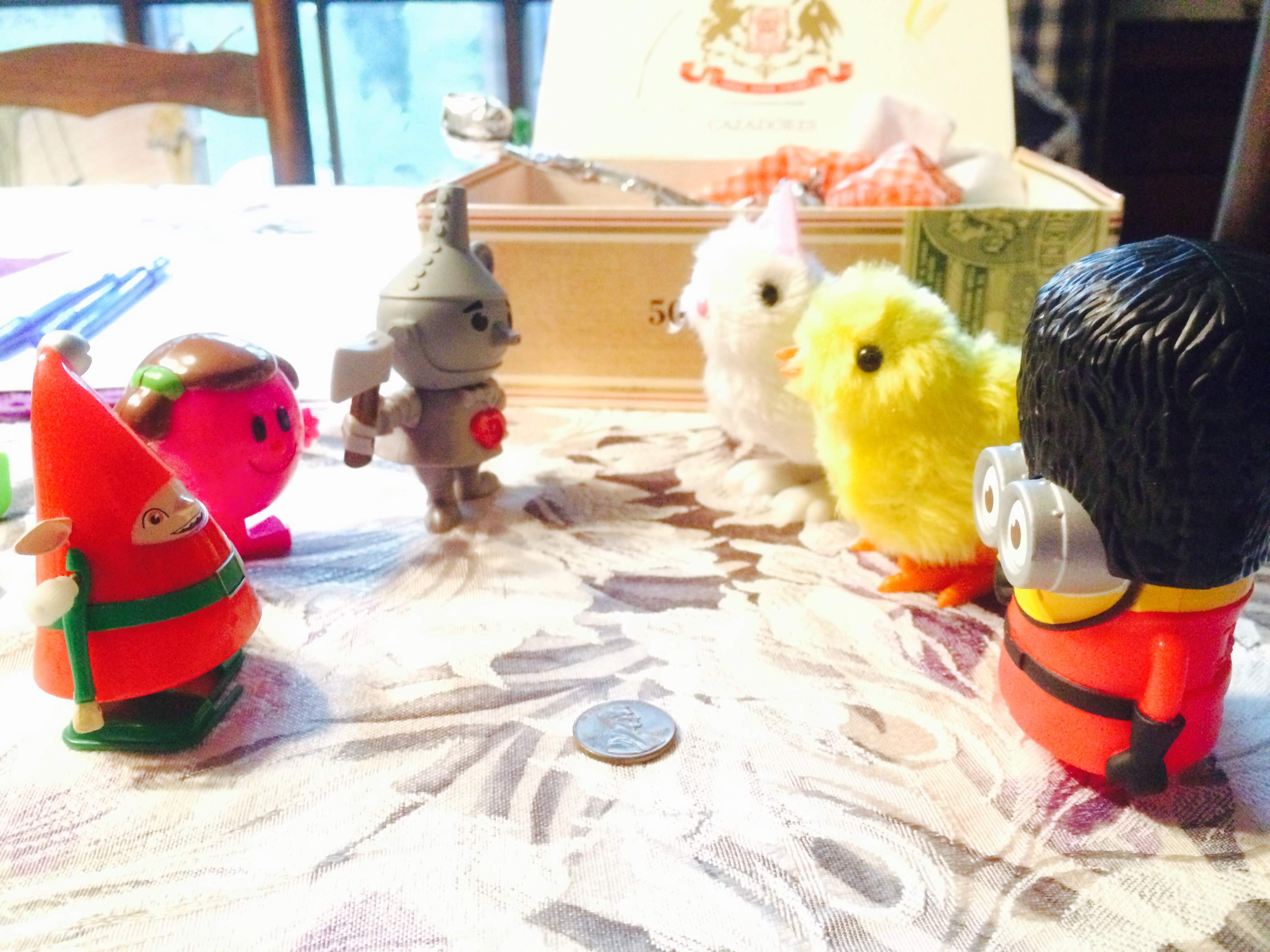 I always had a great reason that related to a very special memory! HA! On a scale of 1 – 10, I was a 5 on the hoarding scale. I’m improving. So, when I would run across a little toy (those are my favorite), I would put them in this small box. One day, my little grandchild will visit, and we can play with these special toys! My husband is actually playing with them right now. He is lining them up and taking pictures. I’ll be sure to close with his photography/play session.