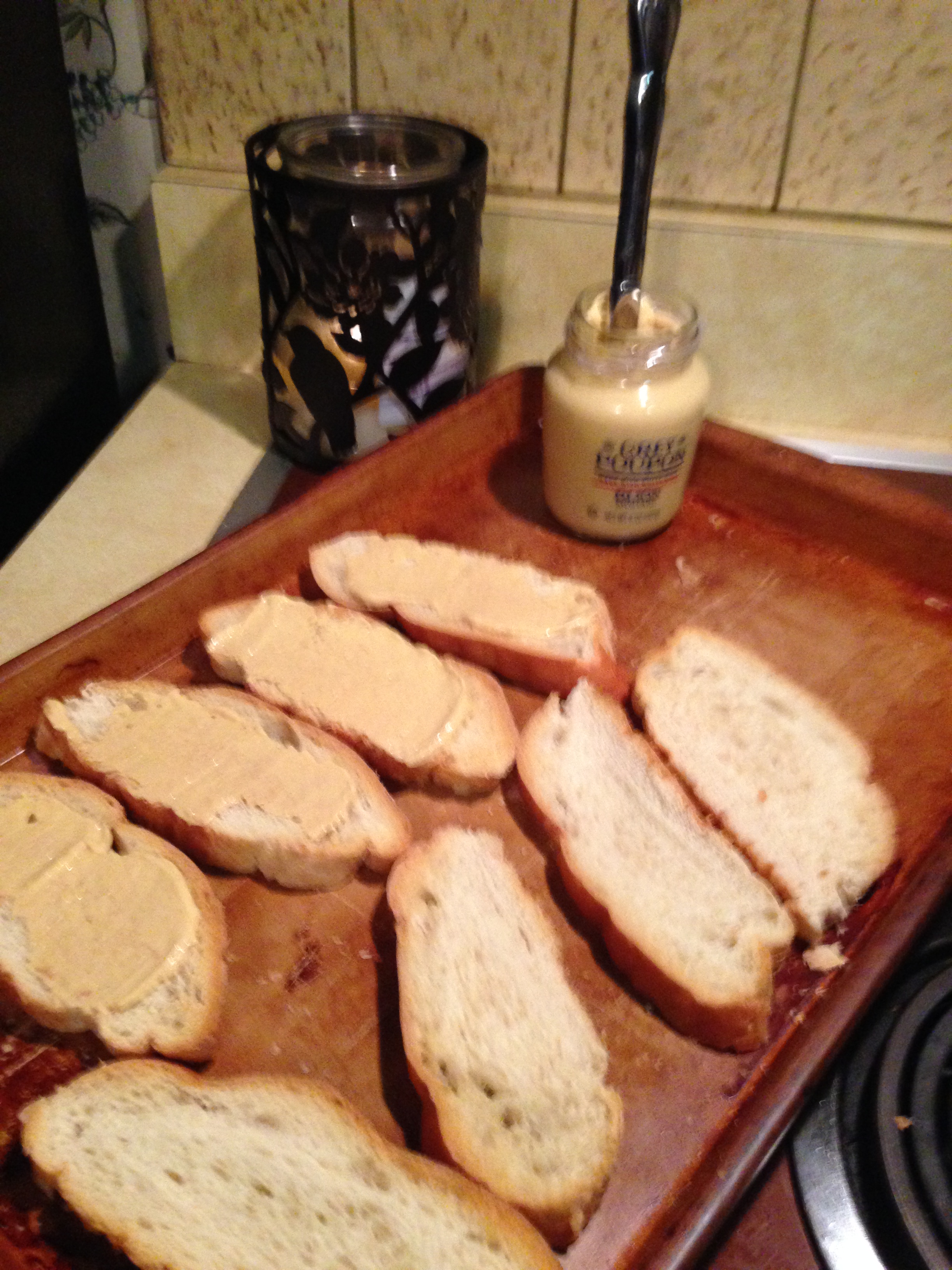 - 8 slices toasted or grilled country bread, sliced 1/4 inch thick