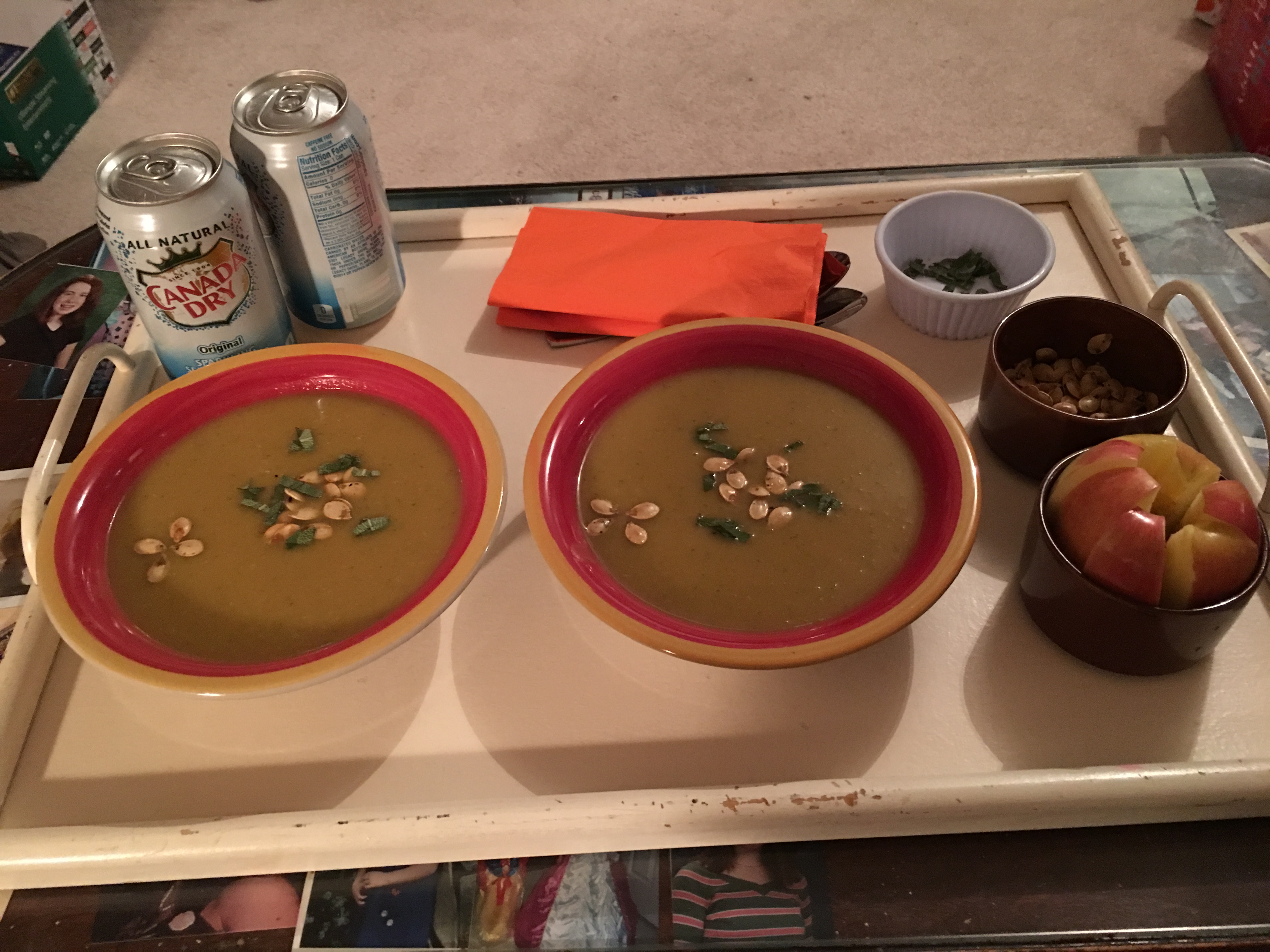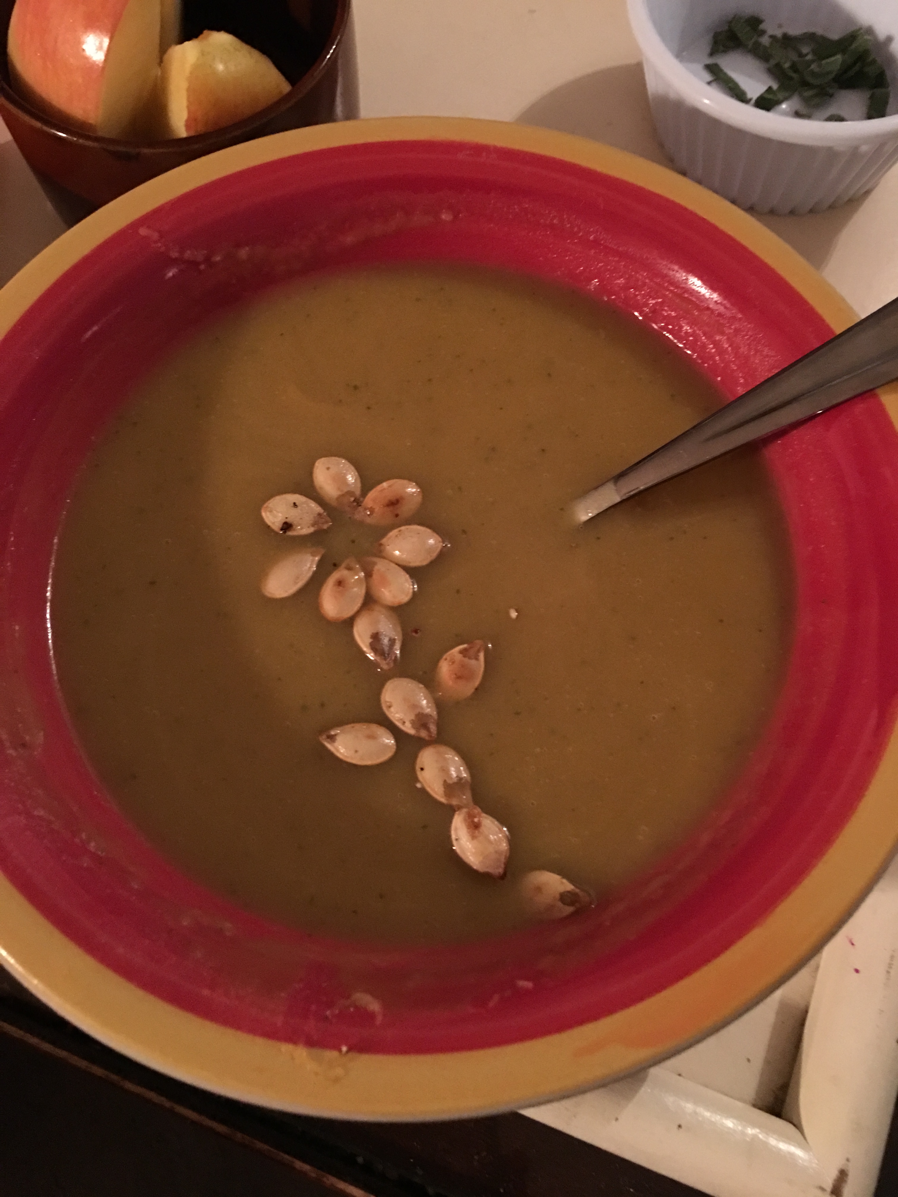 Garnish each bowl with toasted squash seeds and fresh sage.