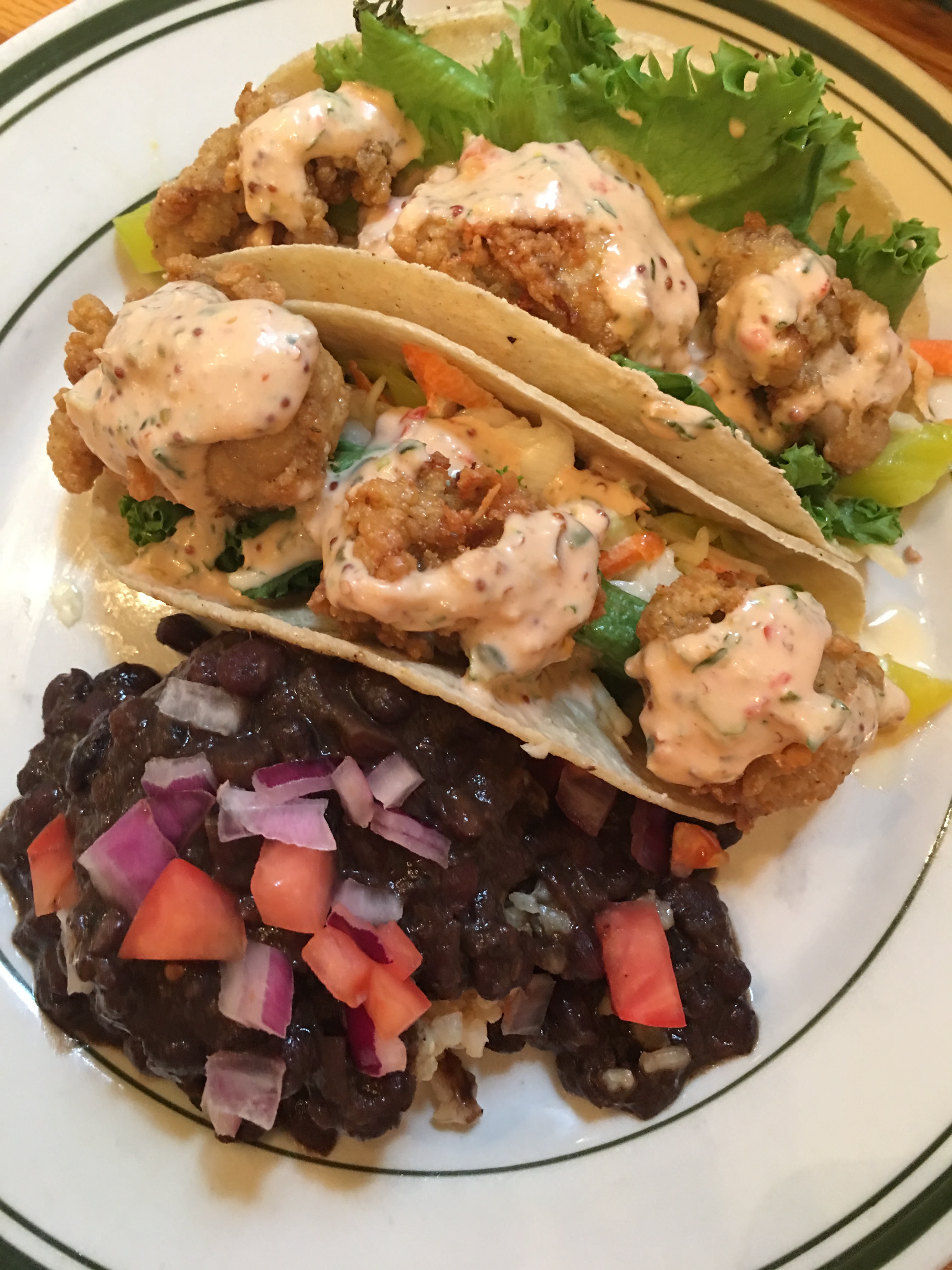 My husband had the Oyster Po’ Boy Tacos with coleslaw