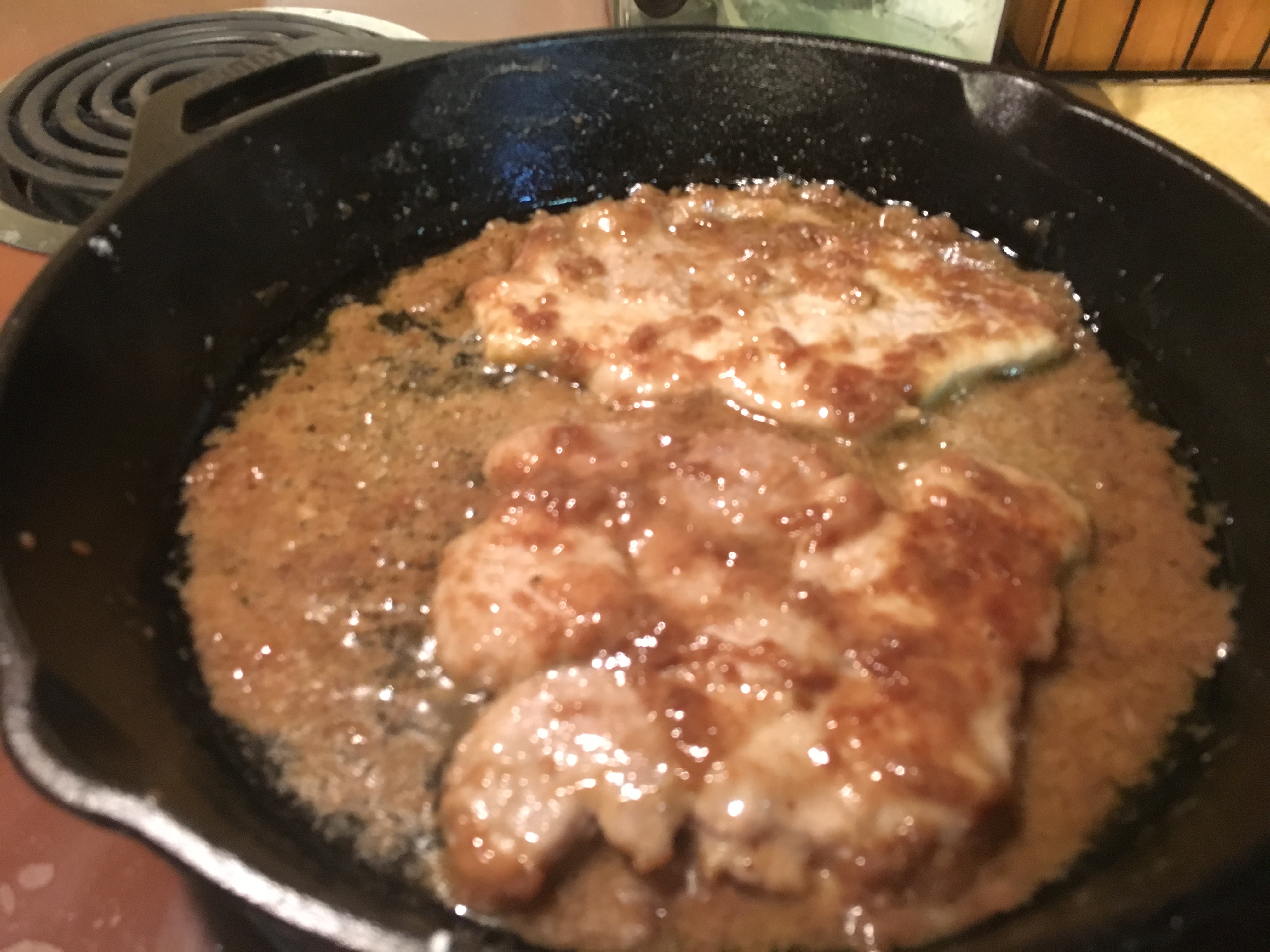Put flour-coated pork chops into the savory onion flavored oil. Cook them two minutes per side. You are not cooking the pork chops all the way at this point. Take the pork chops out of the pan and place on a plate, set aside. With the remaining oil in the pan add 2-3 Tablespoons of additional flour, turn heat up a tad to medium high, stirring until bubbly. After it’s bubbly, turn the heat down to medium low. Let the flour in the oil turn to brown while stirring. Add a half a cup of chicken stock (or chicken bouillon with water). Cook down until it’s a thick gravy.