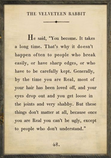 The story of Velveteen Rabbit reminds us of the journey of life not only within ourselves but in our relationships.  We must allow conflict, misunderstandings, true hurtfulness to exist.  You can’t be a porcelain doll. My every thought becomes how can I create a porcelain appearance, situation, or relationship. I carefully hold it, clean it up, and protect it so that it does not break. The result? Exhaustion, anxiety, and frustration for myself and others. I wonder why they can’t see, and I question my sanity around things that I seem to not be able to change. What if…