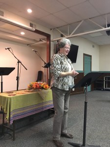 She told a story that God called her to sing on the school bus, Amazing Grace, when she was 12 years old after her mother was raced to the hospital. Her mother’s possible death would have left her in a very difficult situation as her mom was a single parent with three children. Her God shared with her that singing would cast out fear–PRAISE ME! She stood up on her bus and shared her heart and sang–off key. Pretty soon, after the teasing, folks started singing with her. The bus driver called her over after the bus was emptied. She started crying. “When you sang a wretch like me, God touched my heart.” She told Sharon of her life story and how wretched she felt, but that morning she believed if a 12 year old girl could stand up and sing off key, certainly she could begin to know this Jesus who loves us.