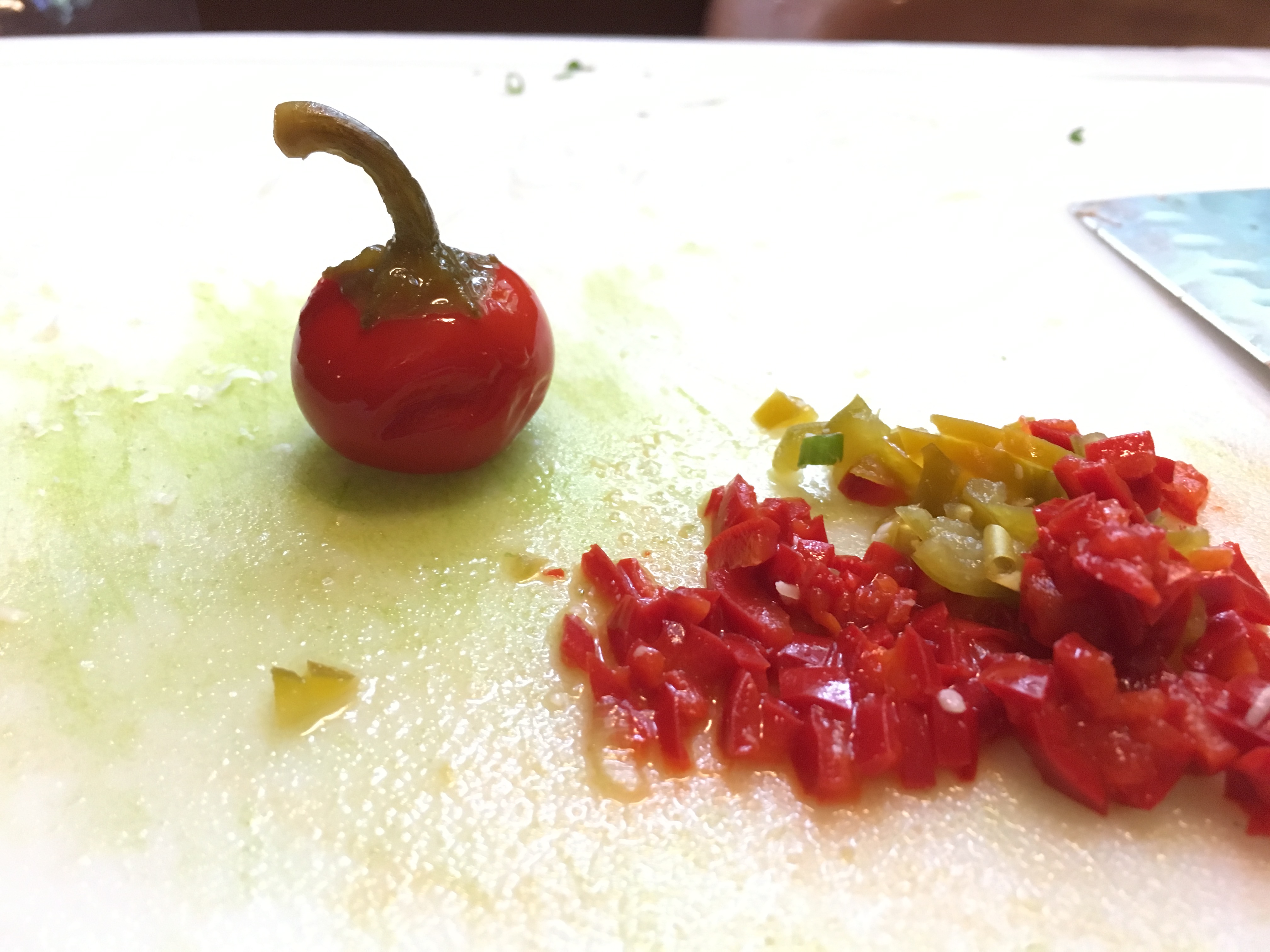 - 2 HOT PICKLED CHERRY PEPPERS, SEEDED AND FINELY CHOPPED, PLUS 2 TABLESPOONS BRINE FROM THE JAR