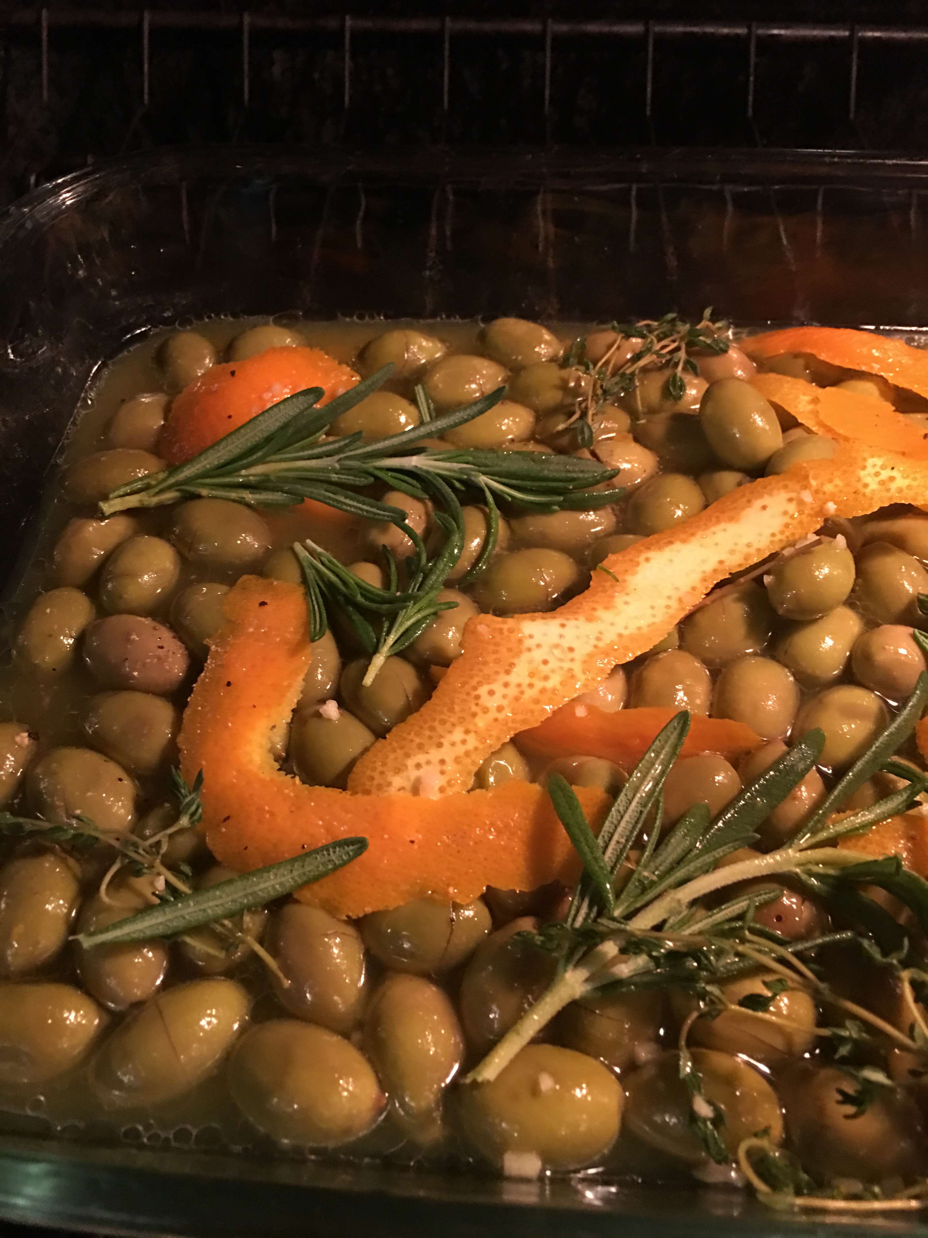 Big green Castelvetrano olives are delicious prepared this way, but any meaty olive will do well. Just change the baking time according to the size. These olives are perfect to accompany an aperitivo.