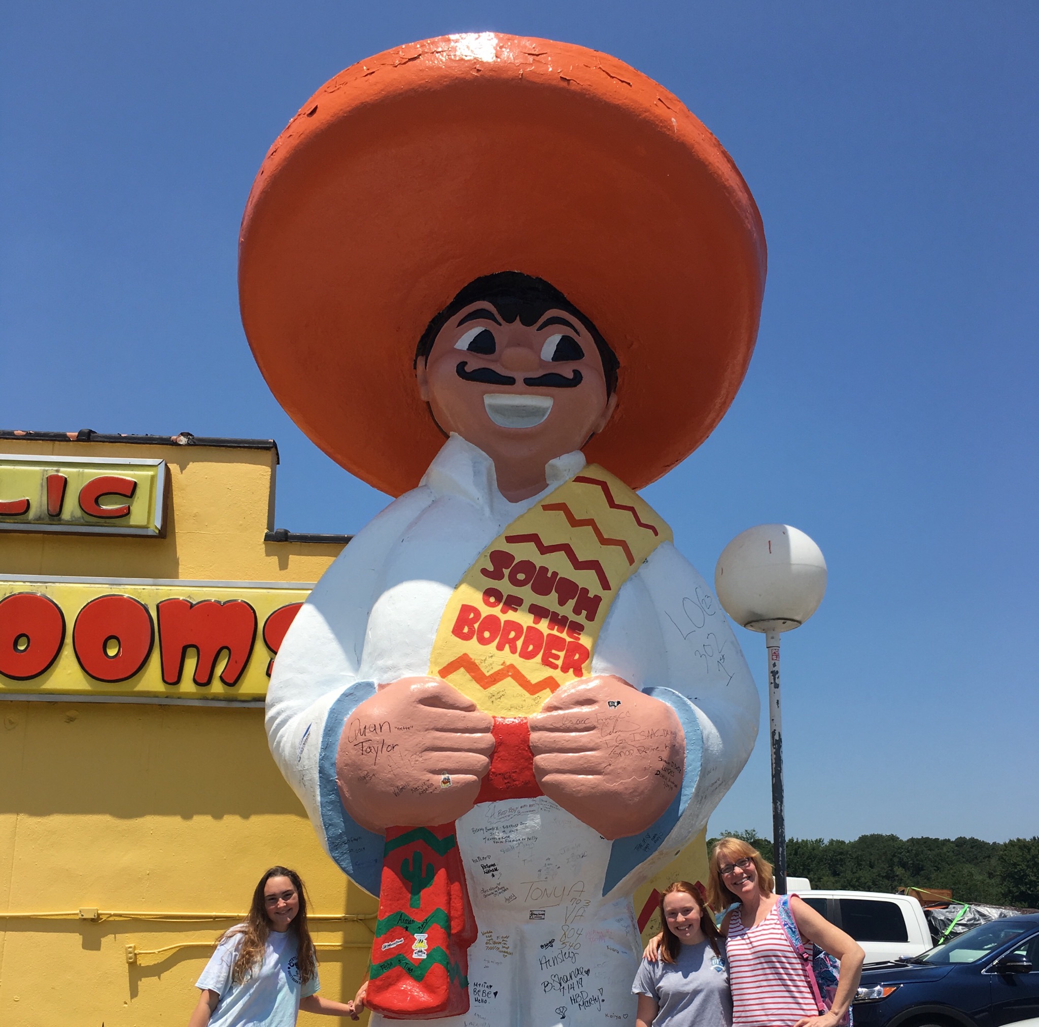 Only 5 1/2 hours away from home, so we decided to stop off at South of The Border. I stopped here as a little girl, but the area seemed a little different this time. I think once upon a time there was an amusement park with rides. We got the typical t-shirt, bumper sticker, and ice cream. Of course we tried on the big sombrero. I never could imagine coming back in my 50’s with my husband, third child, and her best friend. My mom took a picture of me standing in line for the ride when I was about 12 years old. I’m not sure where the picture is at this point, but I do remember the “snapshot” in my mind and heart. Thanks mom and dad.