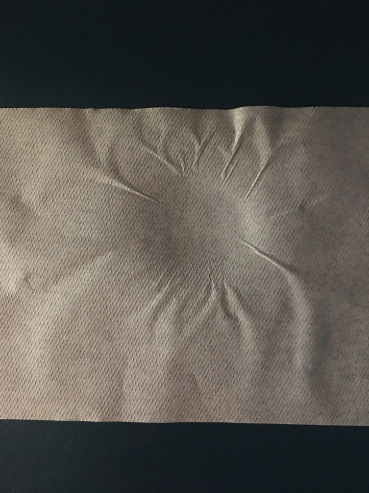 The morning I woke up and found myself “wrapped in leather” and rejoicing in the cracks, I had the greatest experience at my chiropractor. Yes, my chiropractor. We use white paper from a roll to place our heads on the bed with rollers. I got up from my 10 minutes, looked down, and saw this: