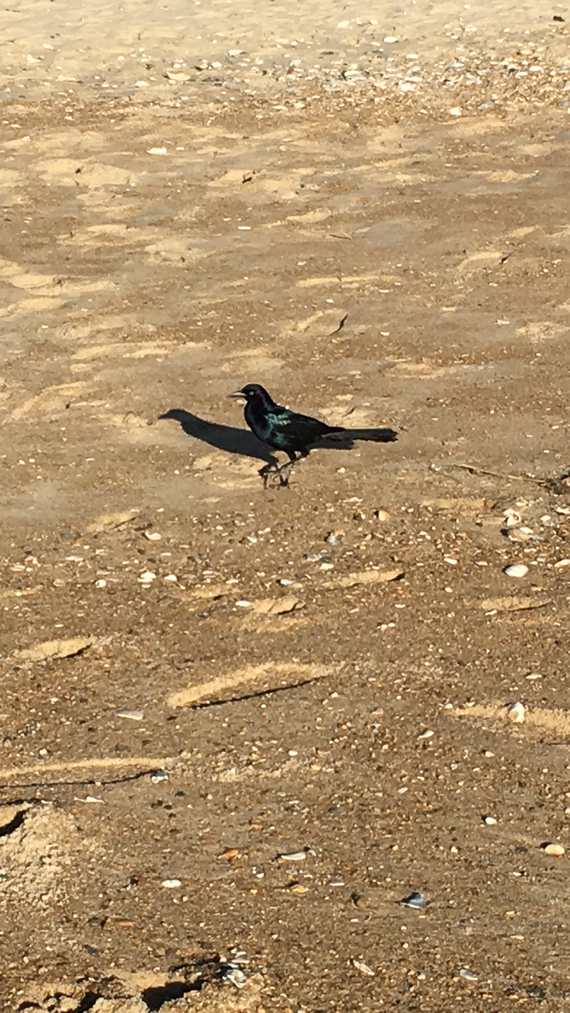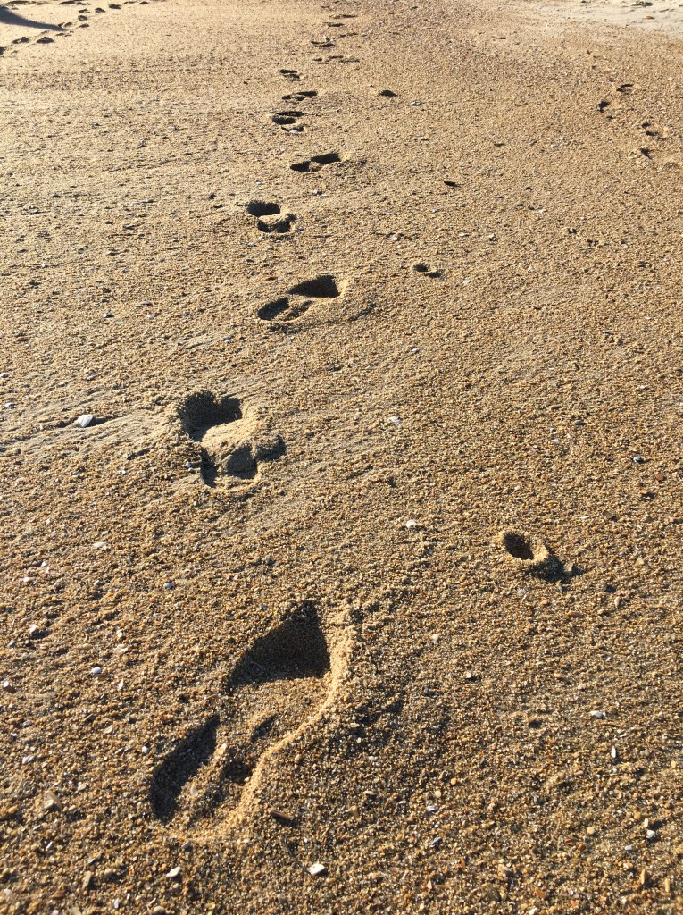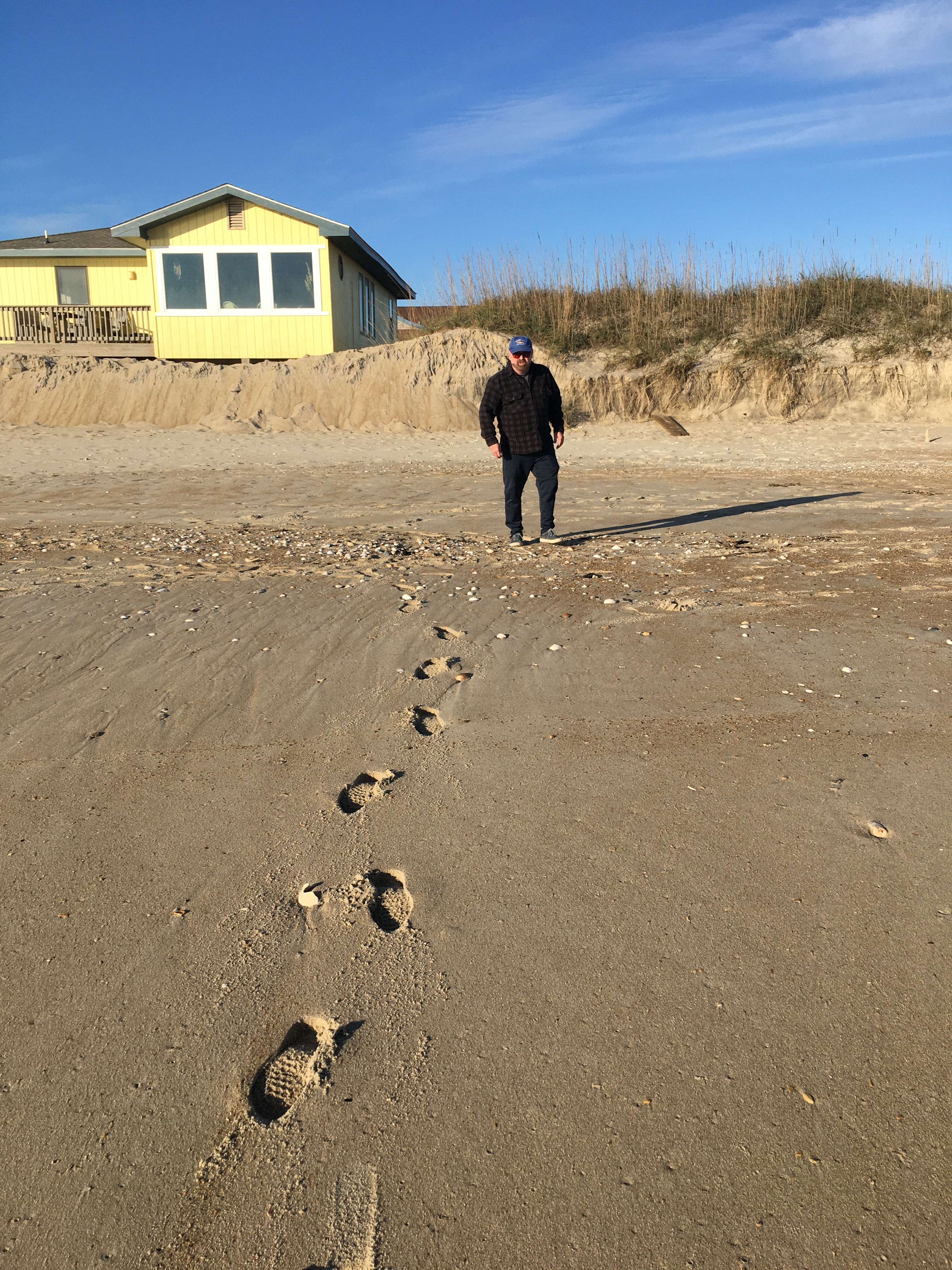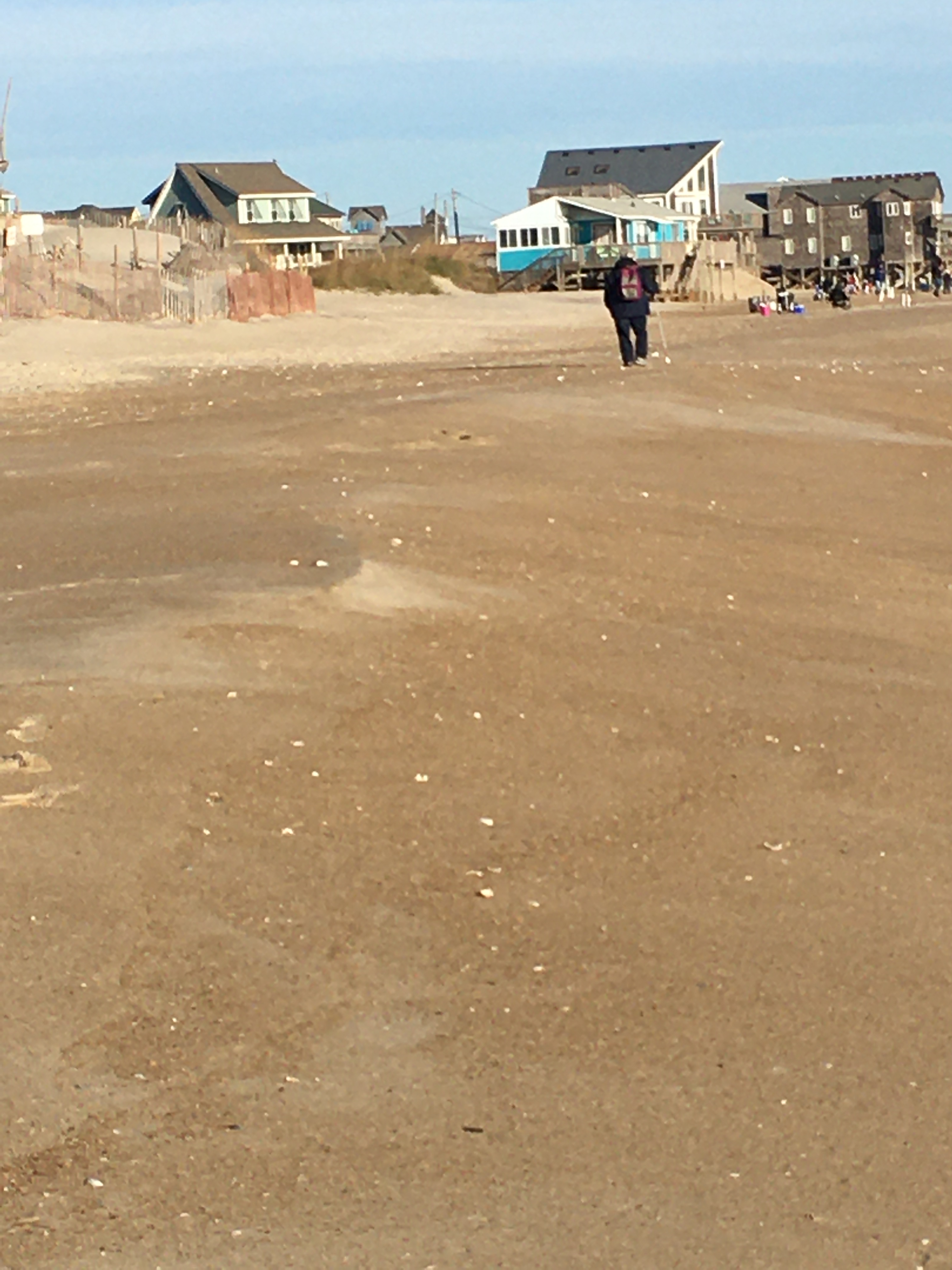 He pointed to footsteps that showed the use of some kind of walking stick. We tried to walk in the footsteps to figure out the stride with the stick. We assumed it might be someone with a wider stance, so probably tall. We didn’t know if the stick with a “round ball” like imprint was a tennis ball on the end of a cane, or just a large stick someone found. Out of nowhere, someone enters the beach from an access point with a gazebo. He walked away from us, and we did not want to frighten him, so we didn’t rush in with our story. I tried calling out, but no luck. We smiled and just thought that the mystery was solved until he came walking back our way. We stopped and said hello and shook his hand. He was hesitant due to a visual impairment. He asked us our names and we told him our story and how glad we were to meet him. We exchanged pleasantries and said goodbye. I shared with Parish, that he seemed cautious. Without being able to see body language or our faces he must weigh intentions of strangers. His connection to the world is unique. I was curious and appreciative of the conversation.