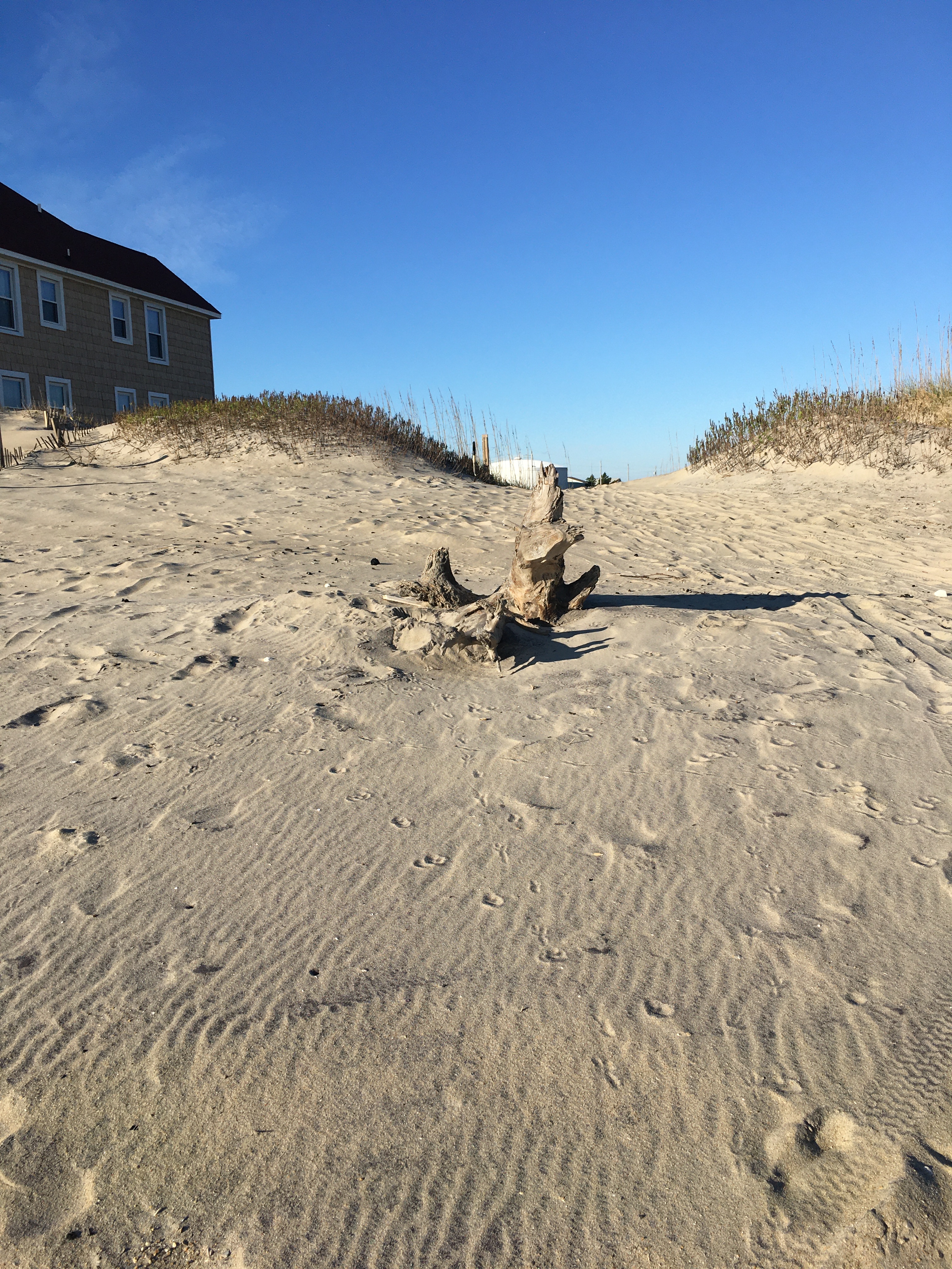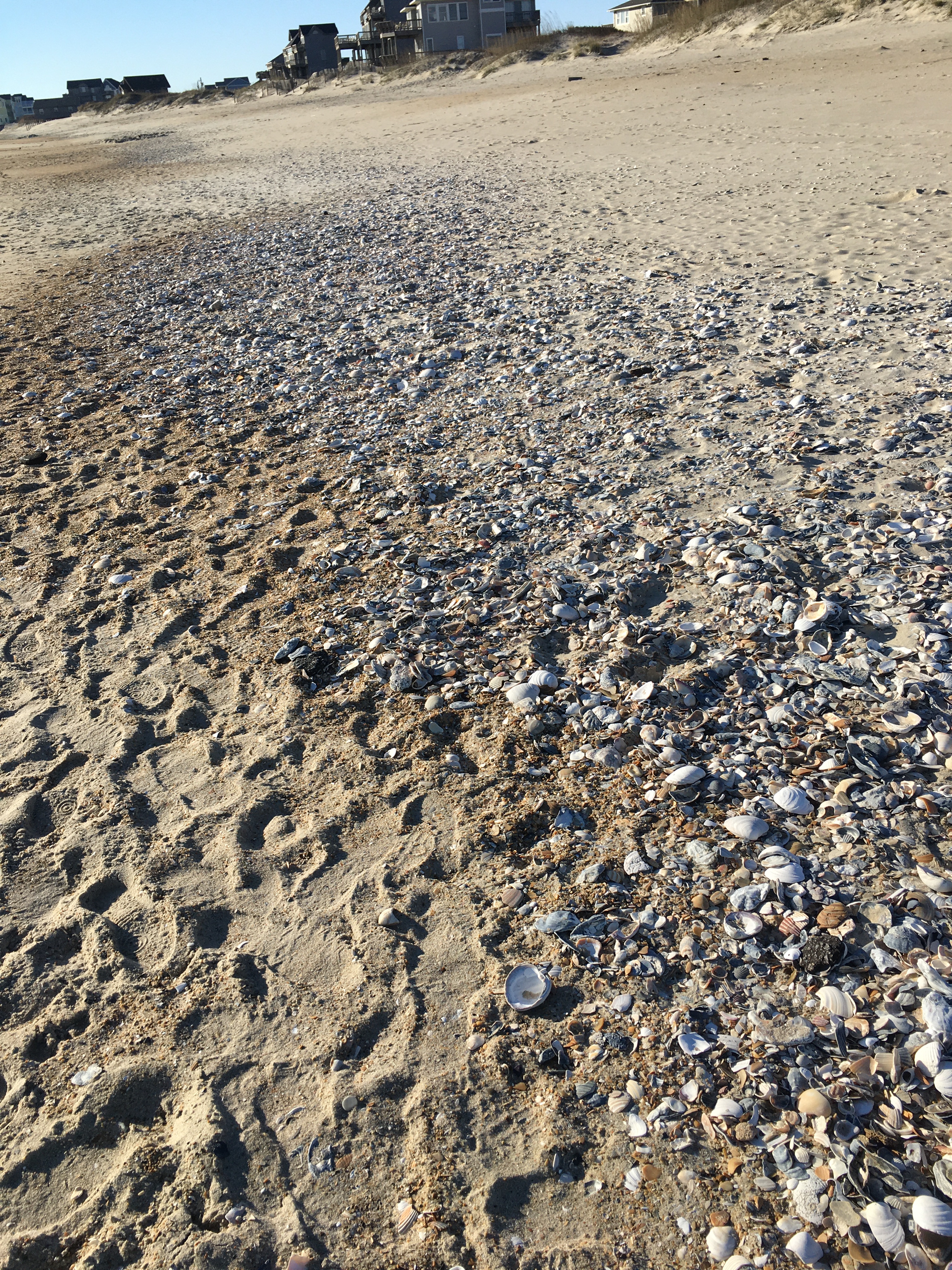 Usually when you go to the beach, you are with family so you are taking adventures as a group, planning the next meal, and reigning in small children. The long walks on the beach as a couple or alone have been filled with noticing and wonder! We woke up to a windy morning that made the temperature feel cooler than it was. We decided to dress warm, ride our bikes, and walk the beach. Almost three hours later, we were home with two bags filled with sea shells and unique finds.