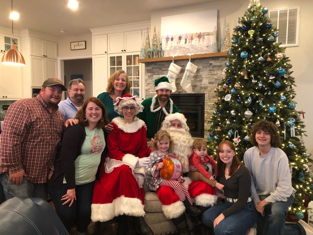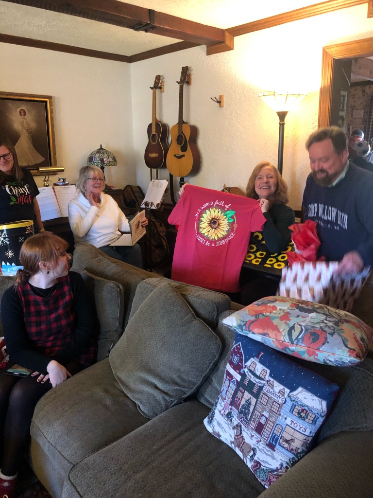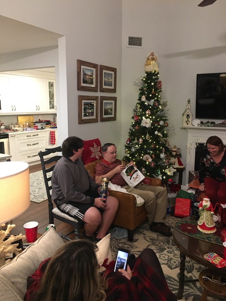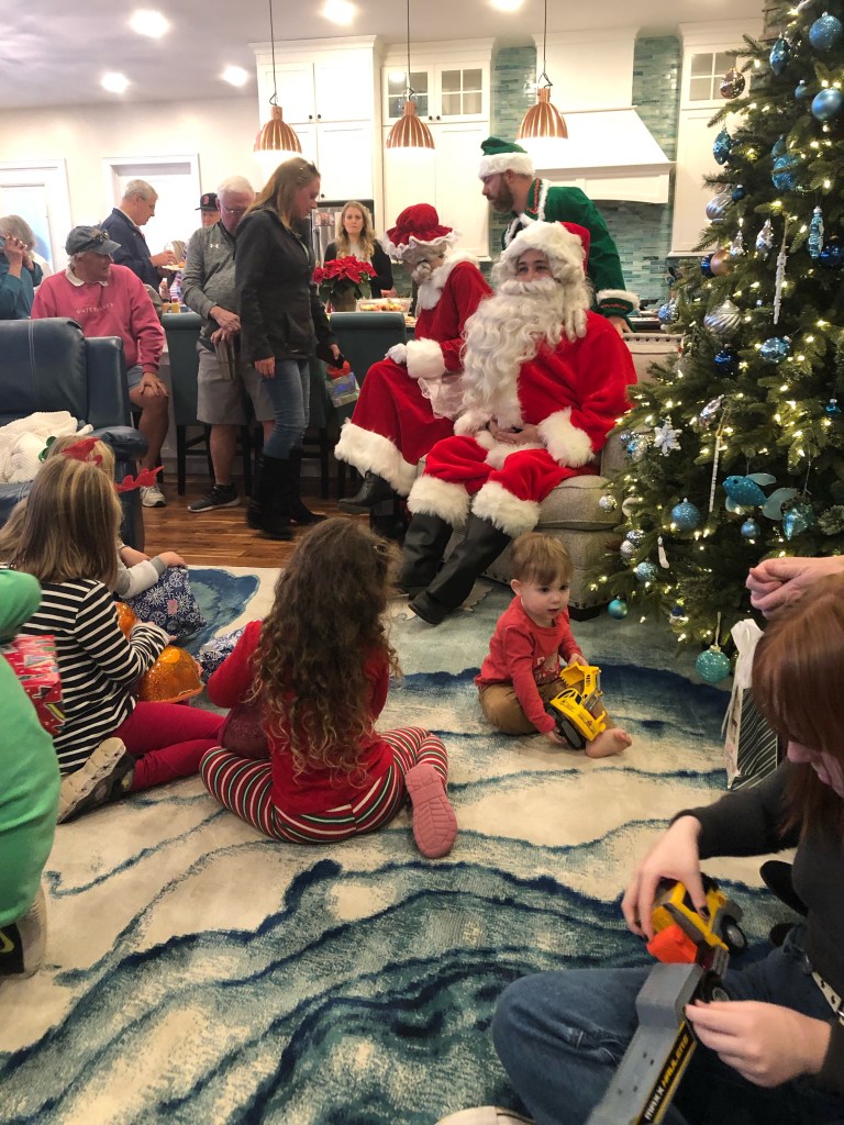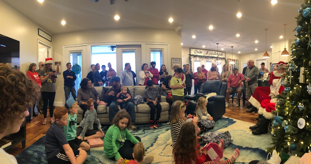 Extended family and friends gathered to celebrate and continue traditions. My sister-in-law and brother have a party early in December. She is carrying on the tradition of her mother. I can remember going to Nana’s house as a little girl when Harvey and Marie were dating. We would celebrate Christmas and enjoy the good food of Nana. Marie is just like her mom–queen of hospitality and fun! Santa comes and provides gifts for all the children. There is good food and laughter in a beautiful river setting. At one point, my view from the sofa provided a panoramic view of great joy. The energy that flowed in the room from everyone laughing and smiling created another God pause. You’ll notice her sign above her window, “Raise A Hallelujah!” That we did!