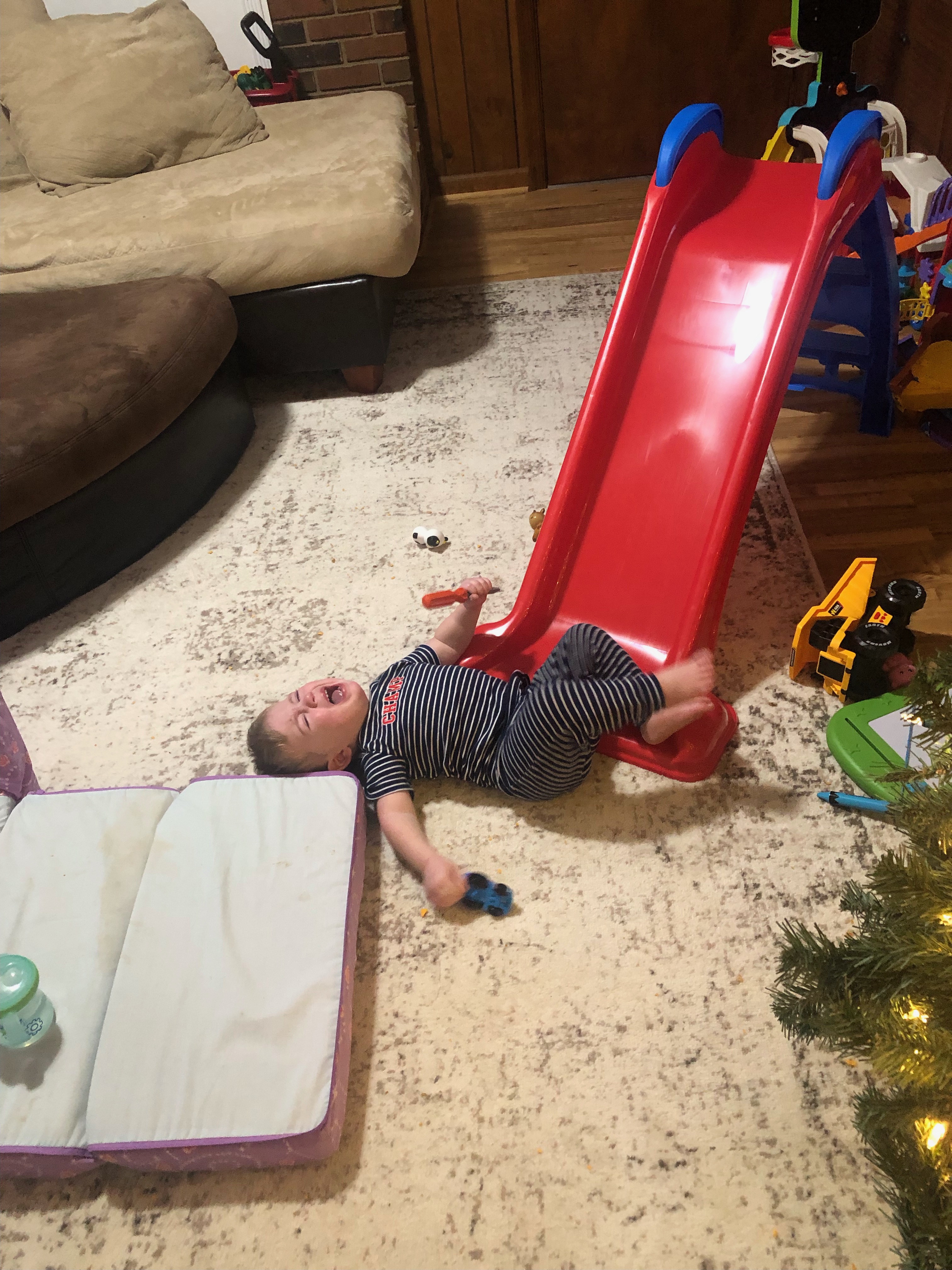 As the days went on, we had this running joke of sweet Spencer Jr finally falling from his new slide. His joy and excitement with his new toy finally had the moment of truth–it’s inevitable! We send the picture to laugh and to remind ourselves to get back up again. Life is too short. We also found it hilarious that his new toy to hold is a screwdriver forever in his hand.