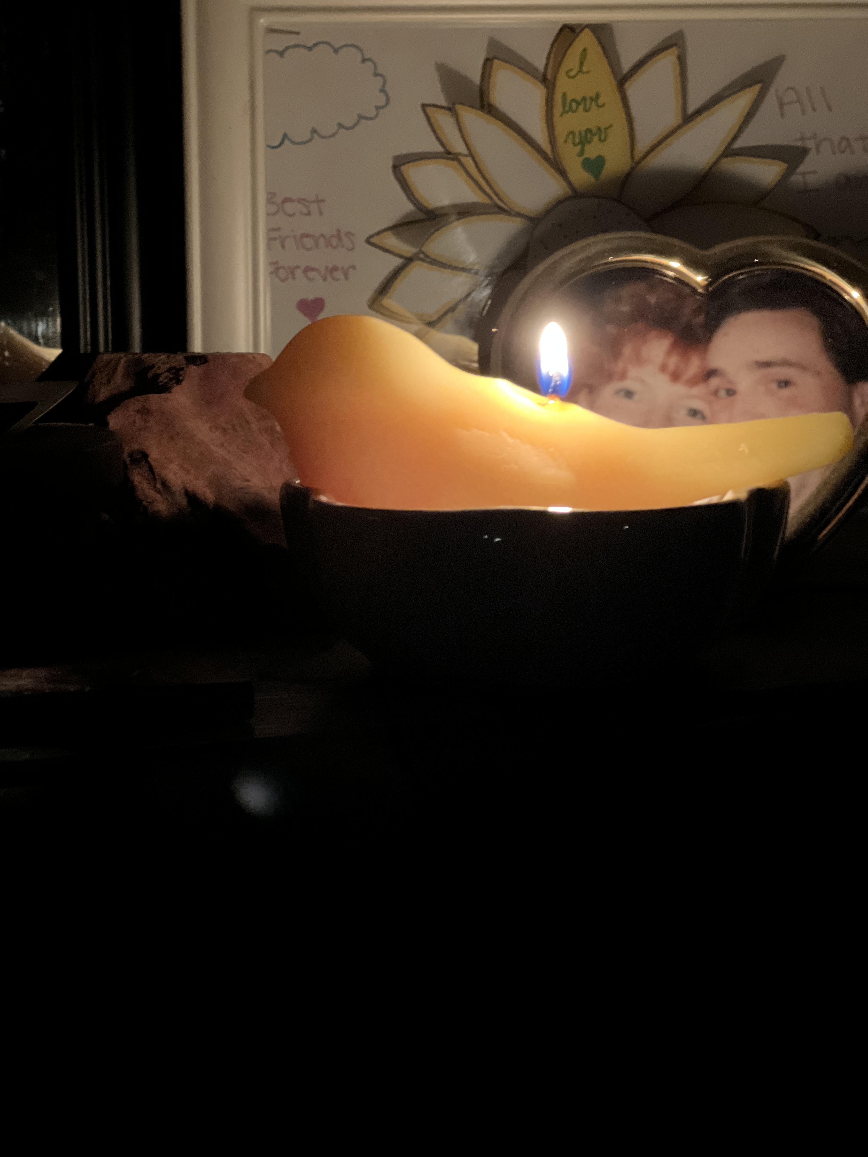 Lighting a candle and noticing the pictures and gifts surrounding the light.