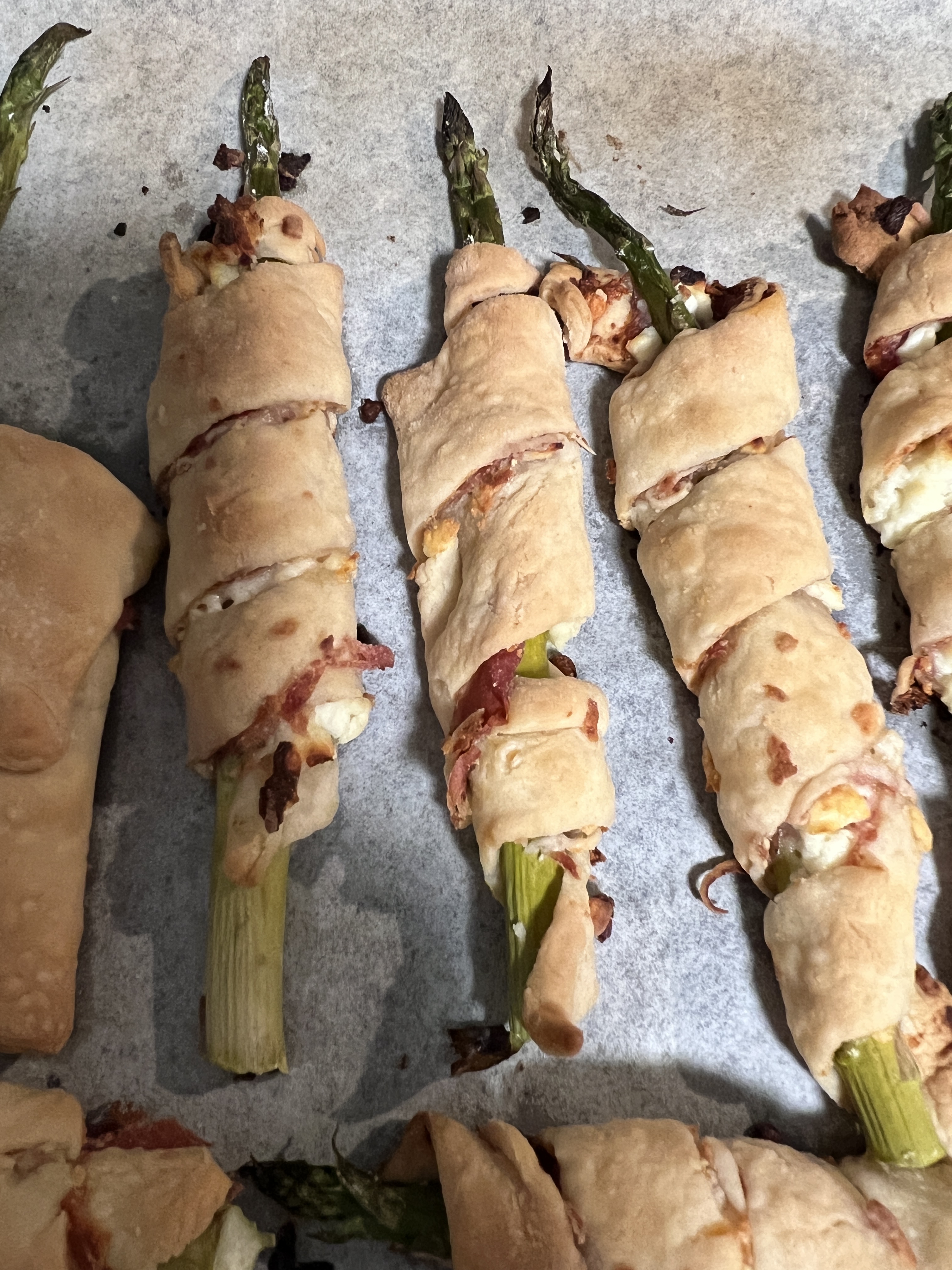 - 2. Using a pizza cutter or sharp knife, cut each sheet into 12 strips (about 1/2 in. wide). Wrap each strip, filling side in, around an asparagus spear; place on parchment-lined baking sheets.