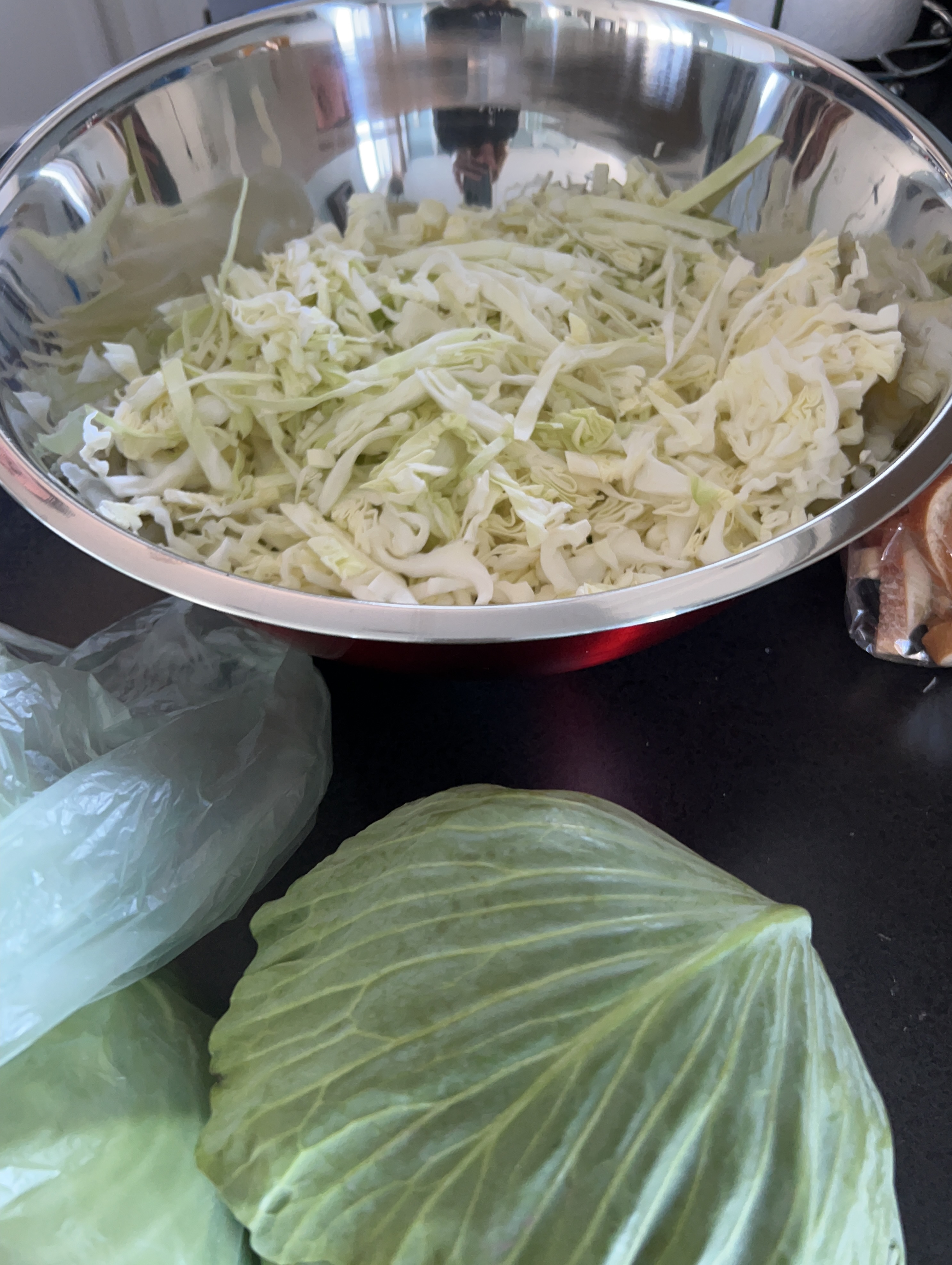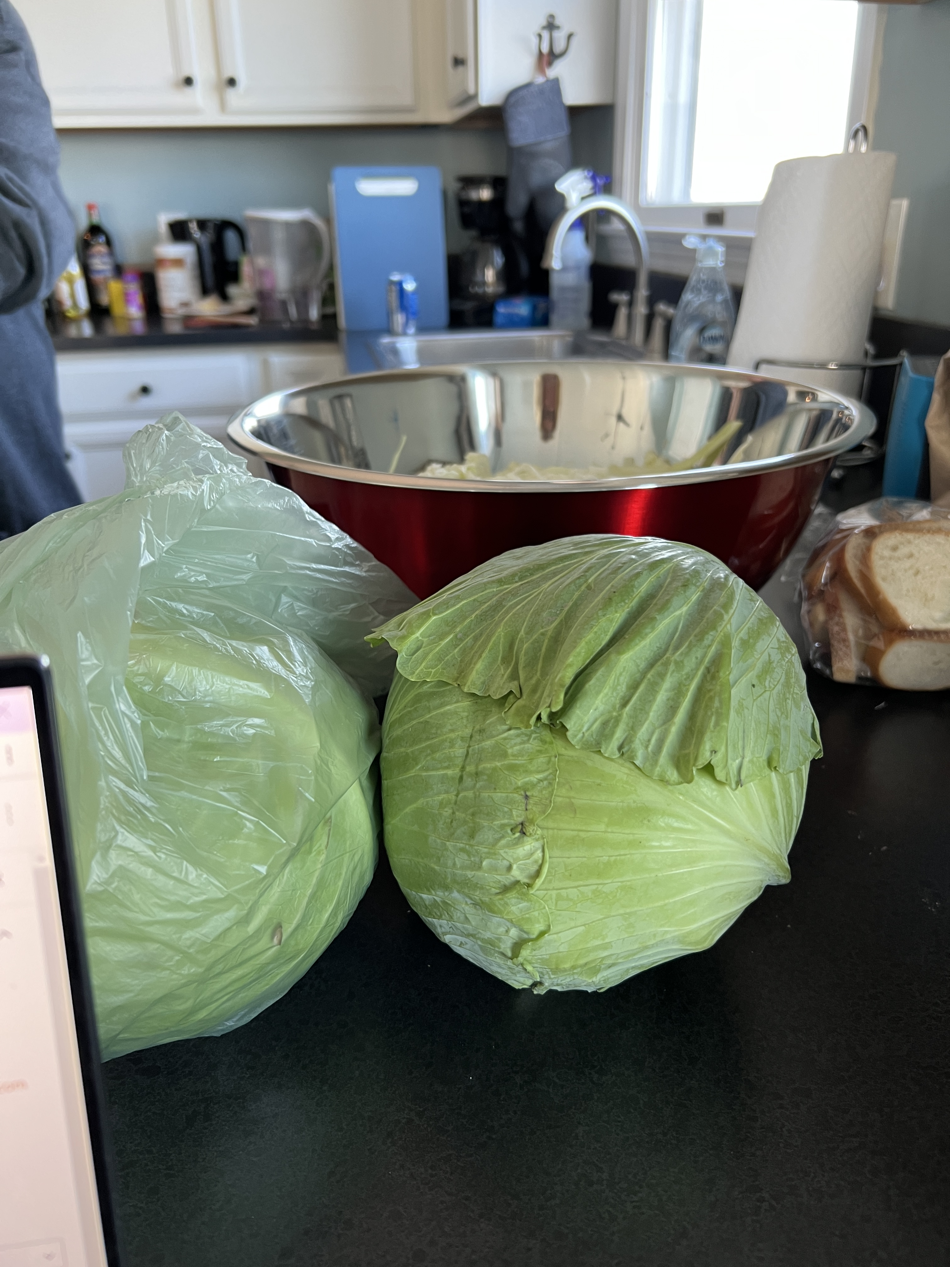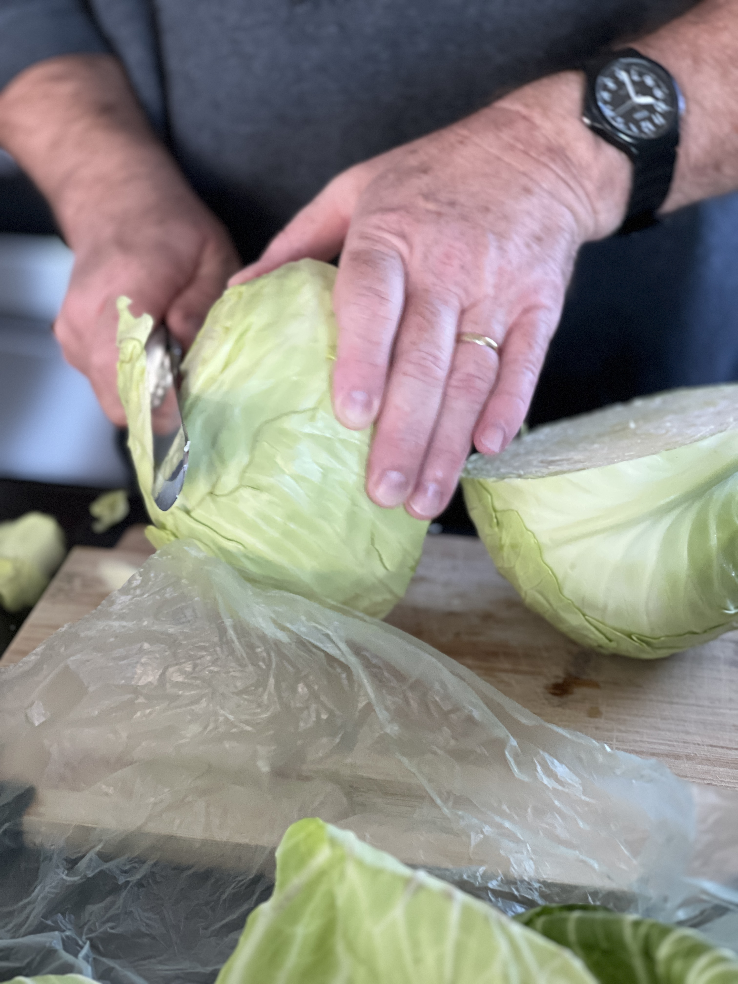 My husband is cutting up cabbage to make sauerkraut. We will ferment the cabbage for about 4-5 weeks, put them in canning jars, and share with friends and family. I decided to sit and supervise while writing and talking to him about my new book, Waymaker, by Ann VosKamp.