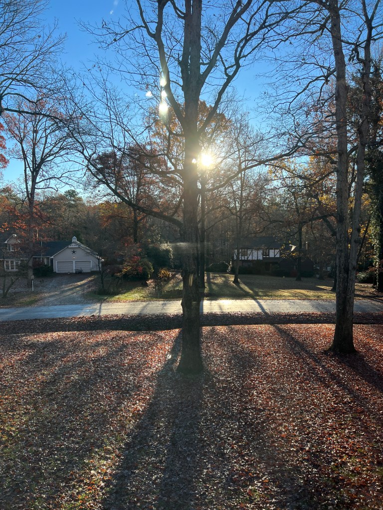 This chapter came the morning I prayed and talked aloud to my Aunt Shirley, who passed away over the Thanksgiving holiday. I took a picture of the morning sky, and when I pulled up the picture, the sun’s reflection through the trees and my camera lens brought me the image of a cross.
