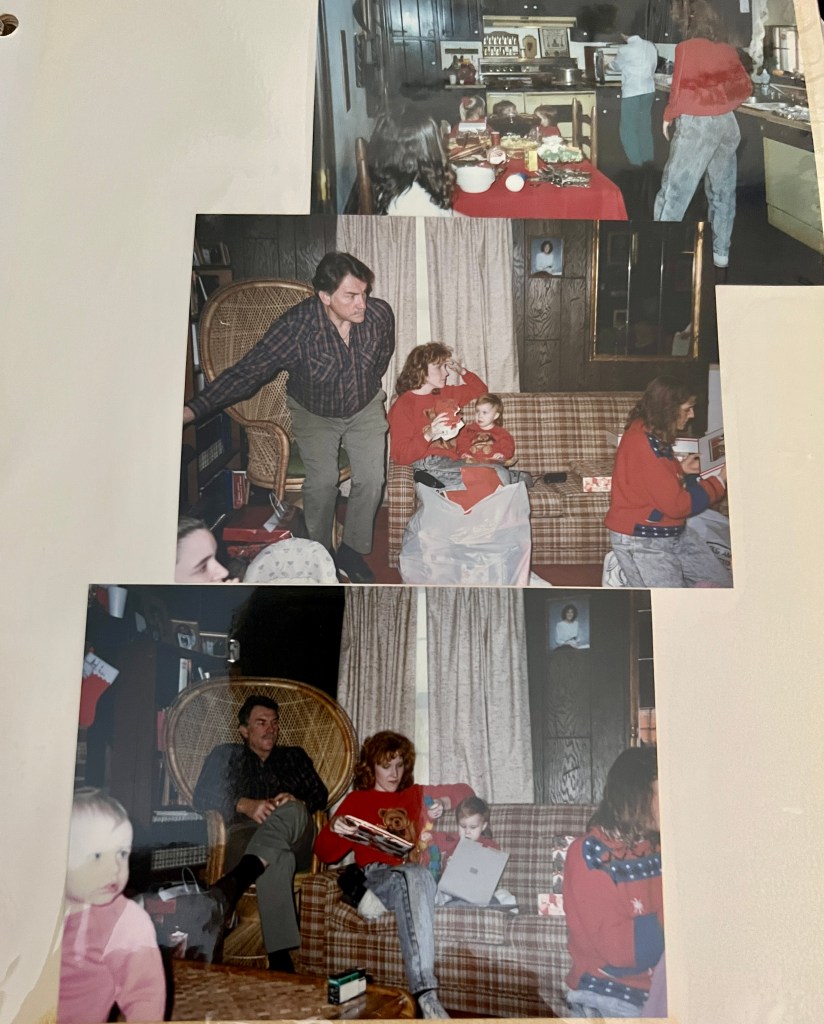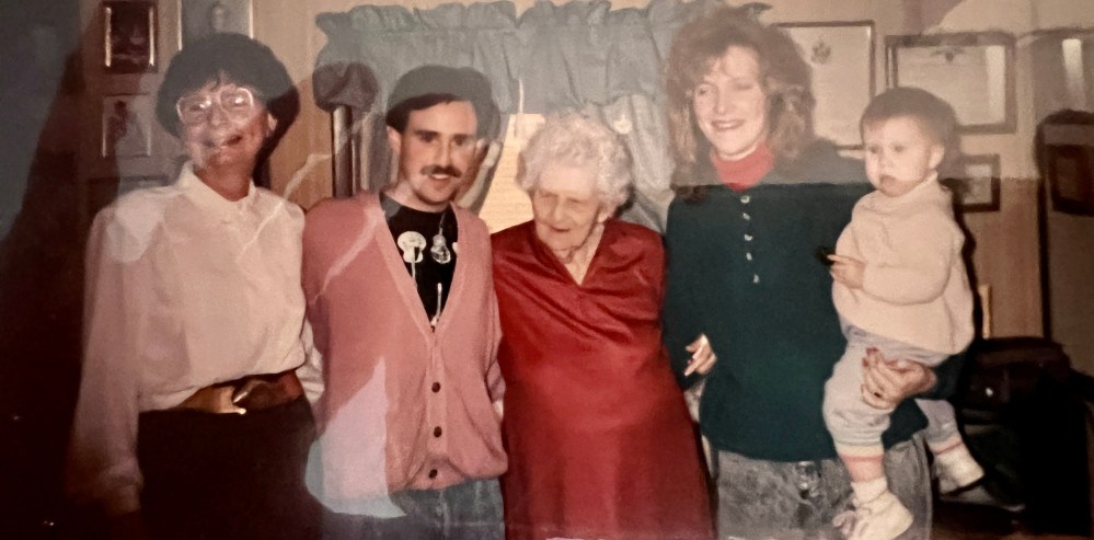 From the left: Uncle Eugene Pierce (Louise’s brother), Uncle Wayne (Aunt Shirley’s husband), Aunt Mary, (Louise’s sister)Aunt Adell (sitting down) and Aunt Shirley (standing up) Mom’s (Louise Pierce Lloyd) sisters.Uncle Bill and Aunt Charlene (Marie’s parents). Look at all the pictures on my mom’s wall. She loved displaying her love for her family. This was probably Christmas Eve. She always provided a time to gather on Christmas Eve.