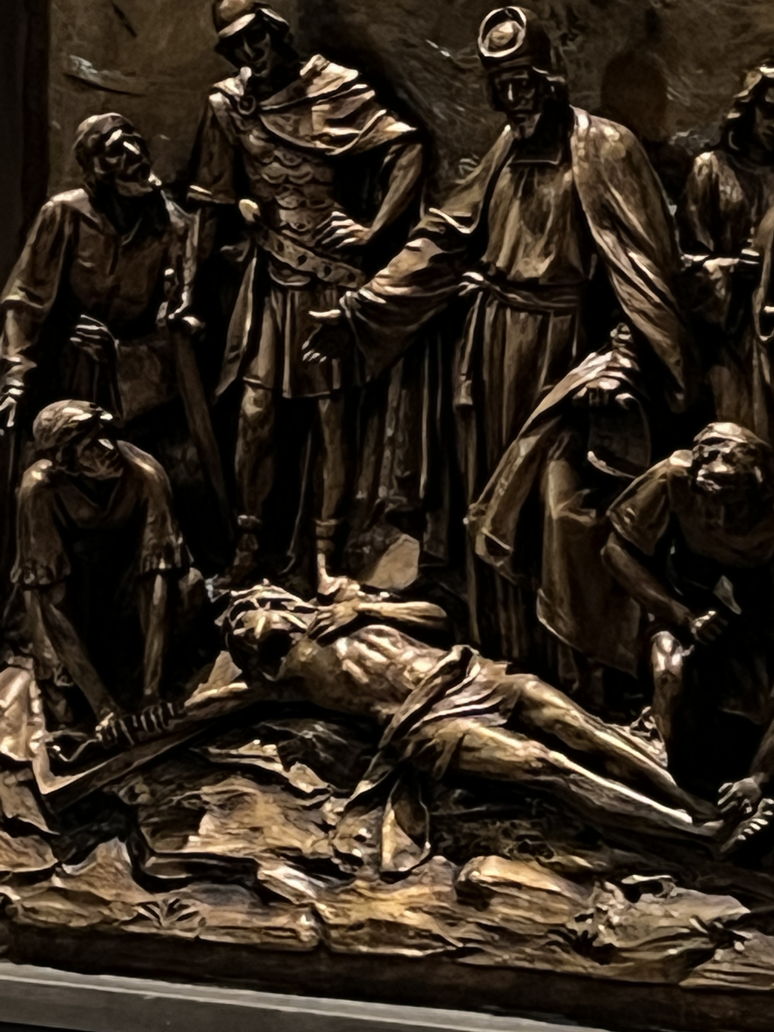 My husband and I attended a service on Good Friday at The Cathedral in Richmond, VA. When I met Parish at VCU, we sometimes attended Mass at The Cathedral as a couple. The service was “The Stations of the Cross.” The priest guided us through the stations of the Cross with readings and prayer. After the service, we went back and walked the stations and took the time to meditate and examine the works of art at each station.
