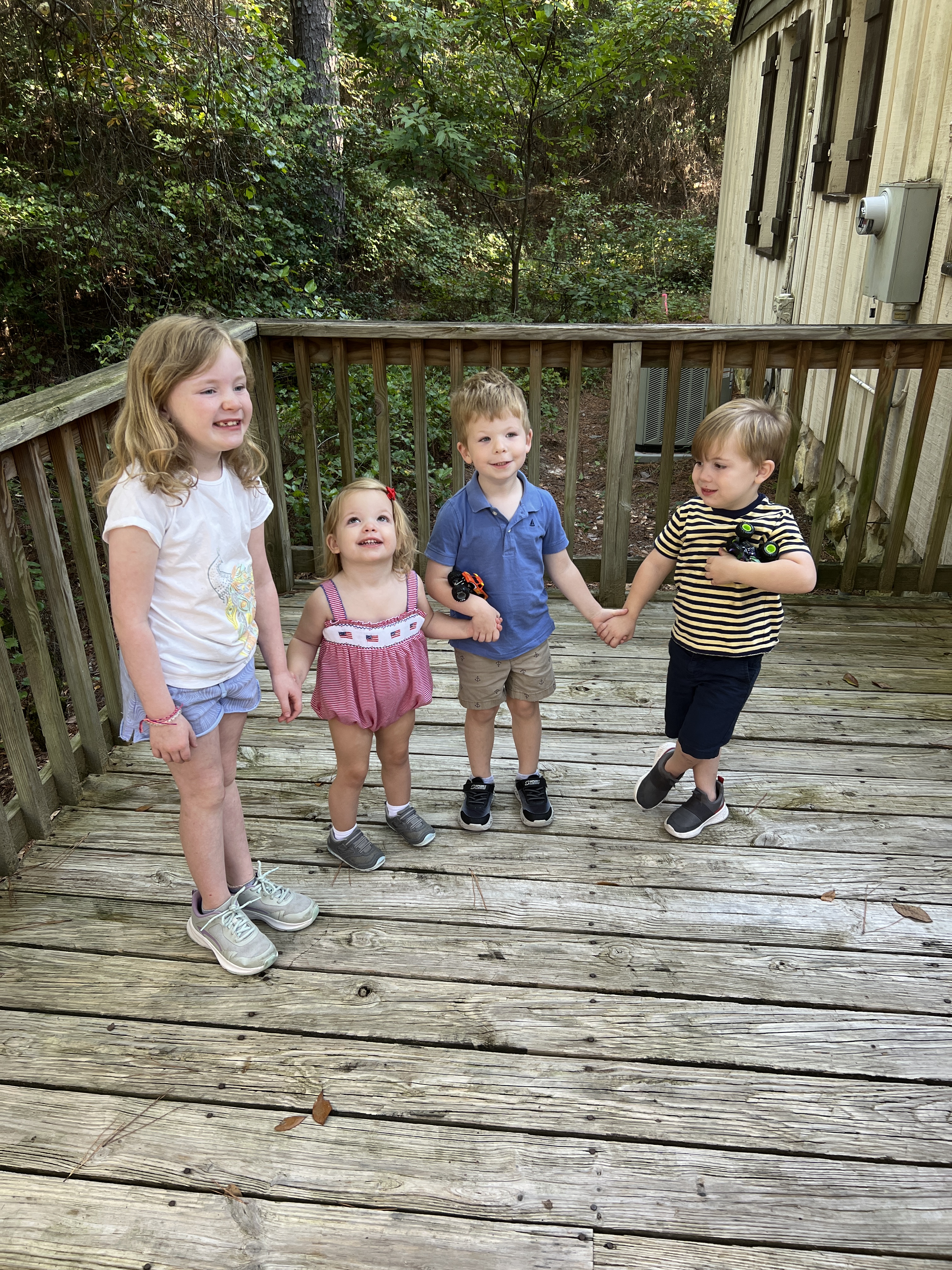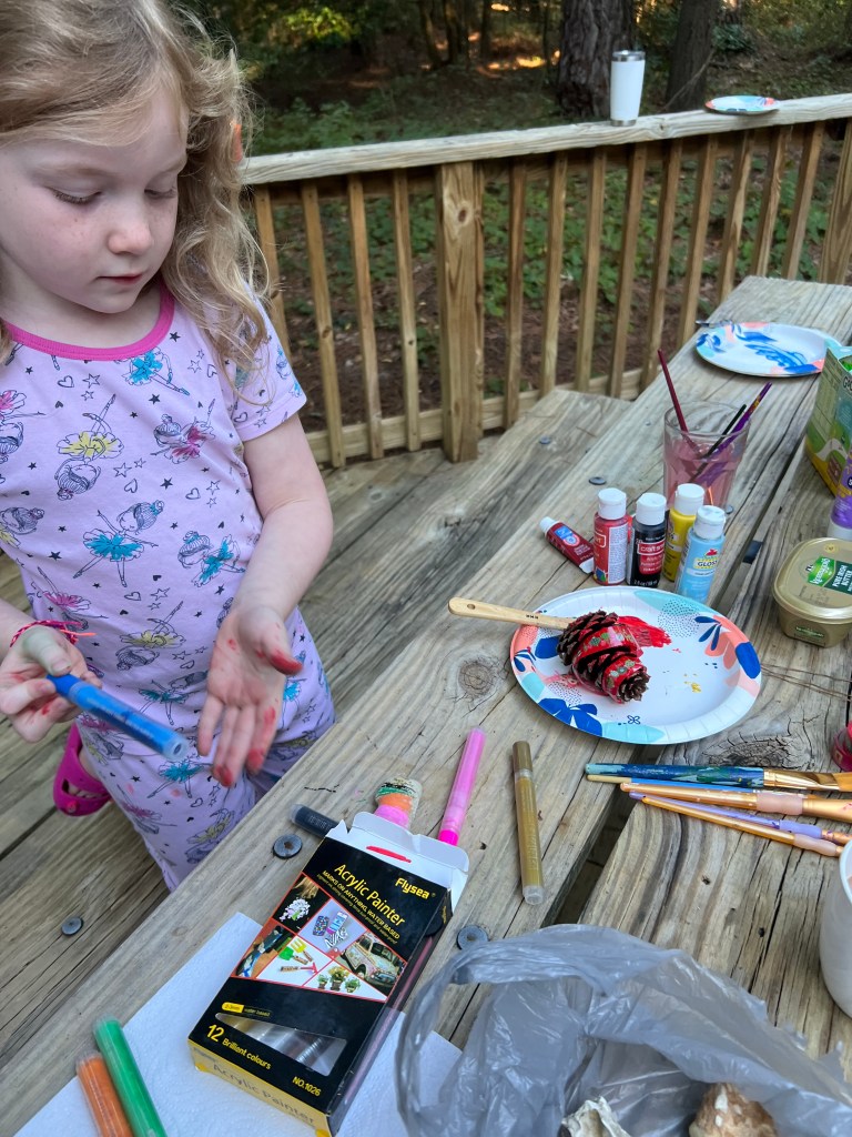 Breakfast with your family and early morning visits. Parish and I usually join the Lambs for breakfast, do crafts and invite folks to stop by for coffee and a visit. Adelaide and Spencer, Jr. were excited to find so many pine cones, so we decorated those with glitter glue, ribbon, and paint.