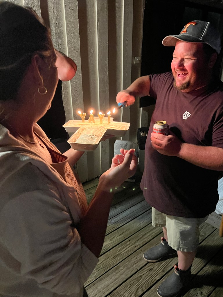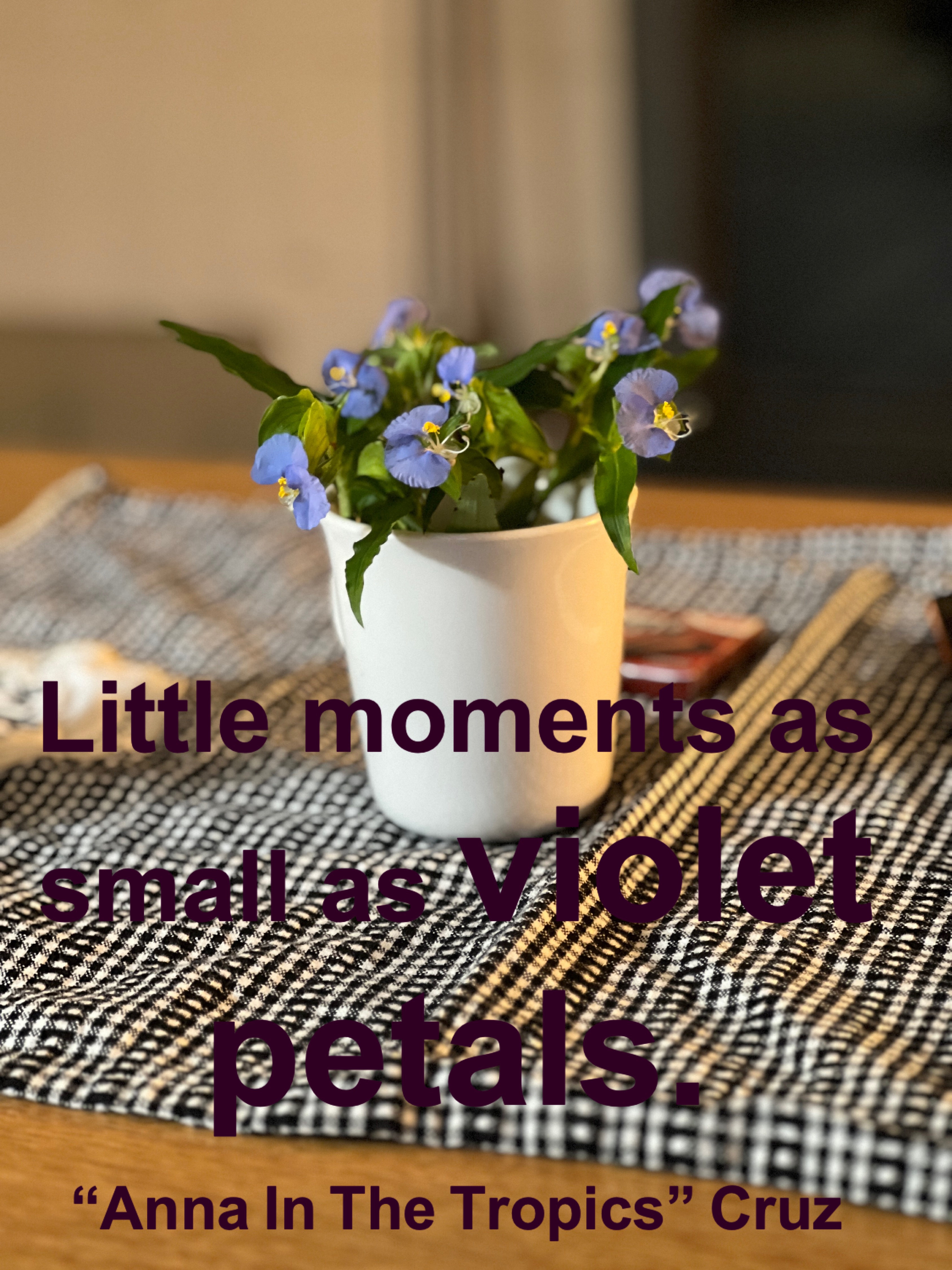 Check-in, chill, and Grandma Lorrie makes her rounds to the cabins to offer a goodie basket. We all arrive at various times, so we text and check on each other, but usually, we are settling young ones in and setting up our space to inhabit for the weekend. Thursday night I finished my book with Parish. A two-act play called, “Anna in the Tropics.” The quote below is from the book. Parish found the purple flowers and put them in a “vase” for me.