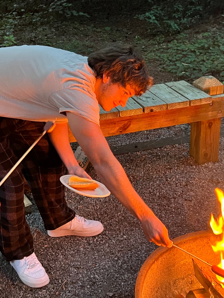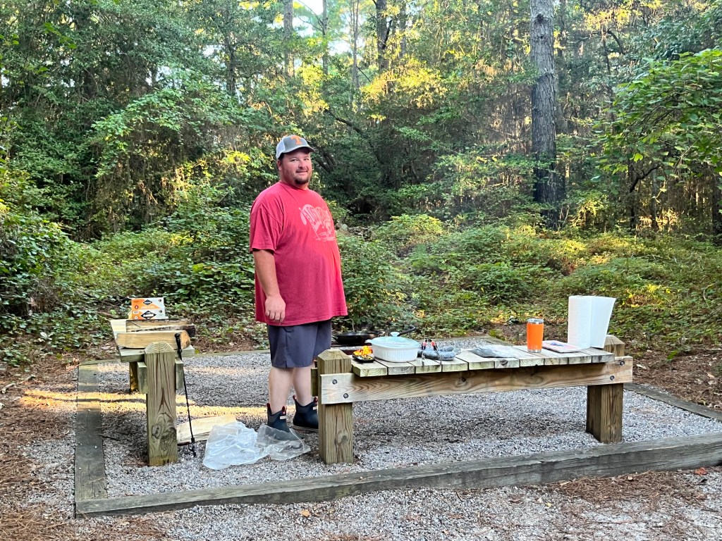 Breakfast was our famous pizza on the grill, cheesy eggs, biscuits, cinnamon rolls, and bacon.