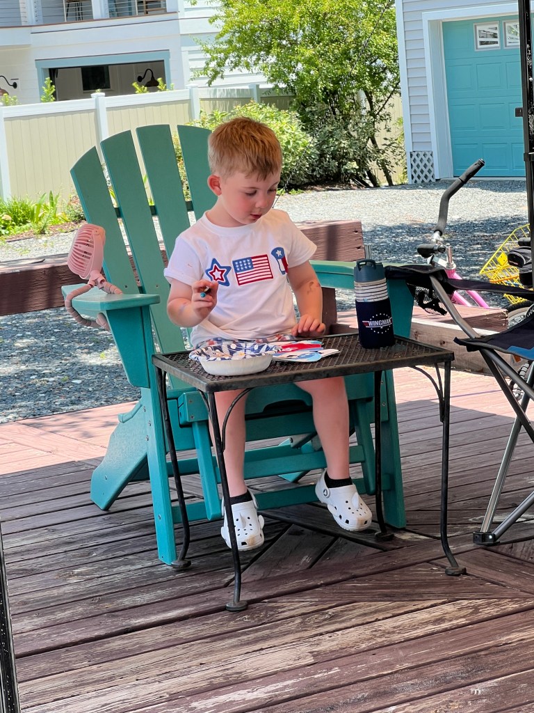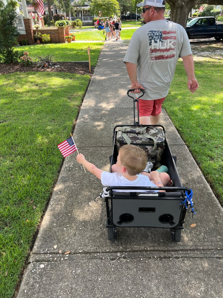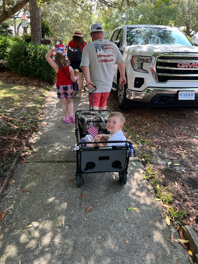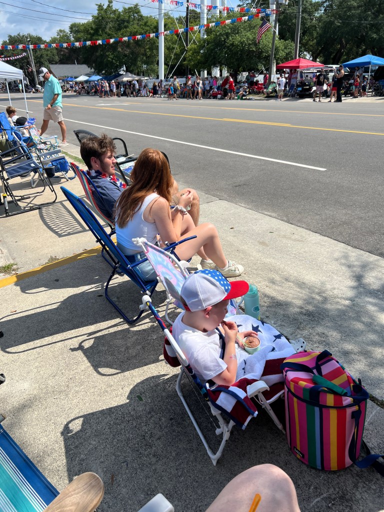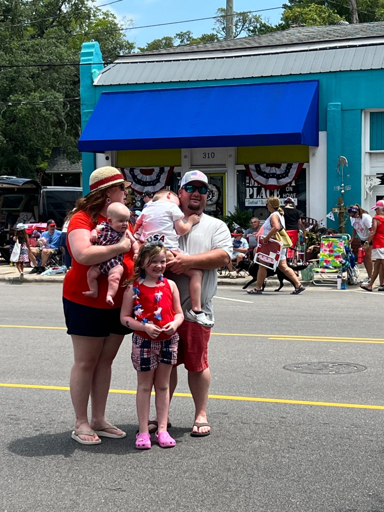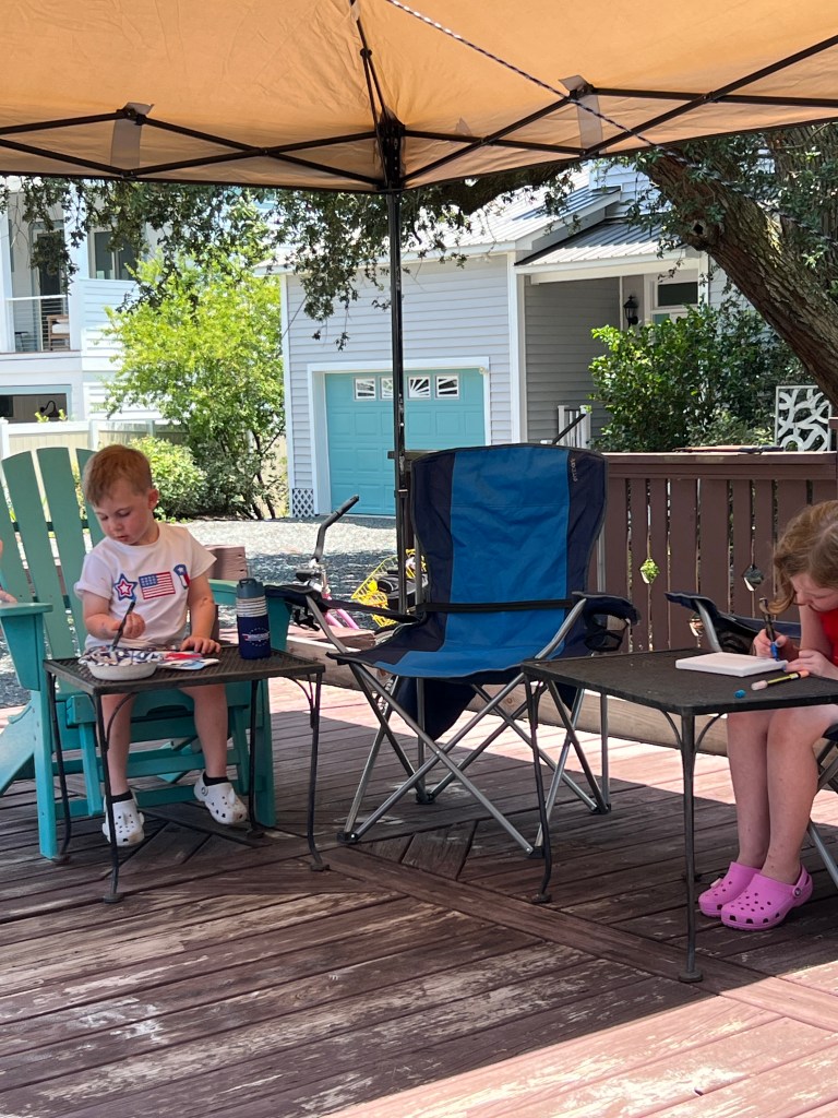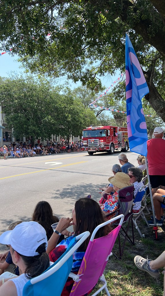 It’s July 4! Time to celebrate! The Lambs came for breakfast, and then we walked to the parade. Early that morning, Parish and I rode our bikes to check on our chairs and went to Burney’s to get some pastries. We purchased chocolate milk for Spender, Jr. -his favorite. The Haven outdid themselves with a fan, mist, and bubbles for the children. The kids loved the parade and all the goodies that folks threw from the parade, like t-shirts, rubber duckies, candy, and flags. We enjoyed gelato and drinks from The Haven. After the parade, we went back to the house and ate hamburgers and hotdogs. The kids were cute, sitting in their cozy spots in the house, working on crafts and admiring nature. We saw some lizards. :0 ) The Lambs went walking around Southport while we cleaned and rested a bit before riding bikes again. We had dinner together and then watched the fireworks from Southport.
