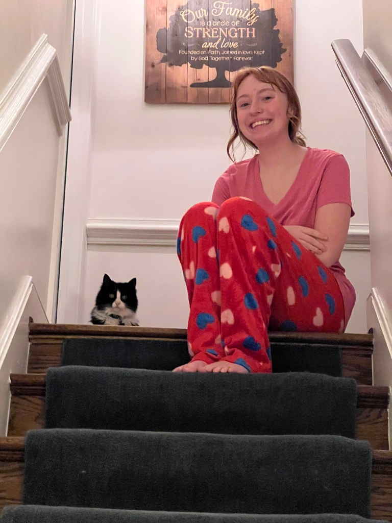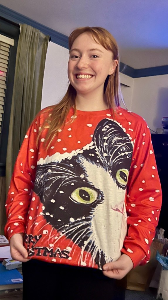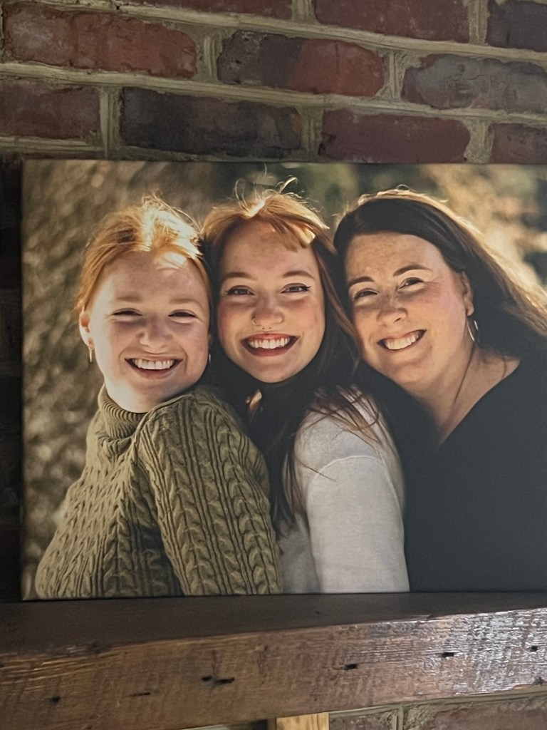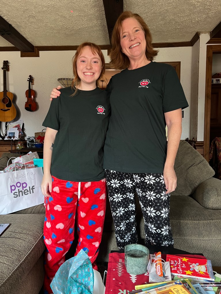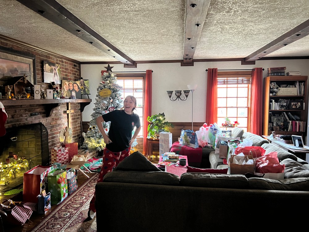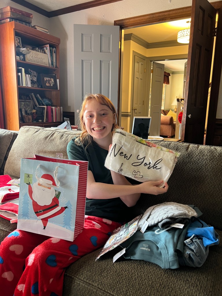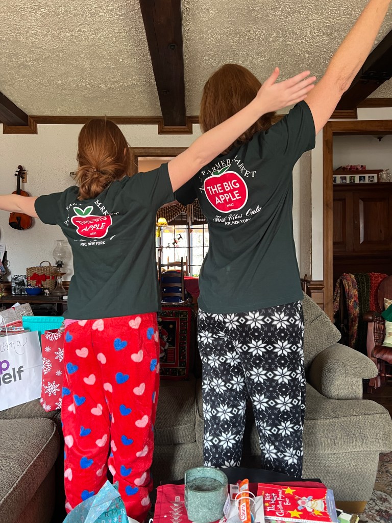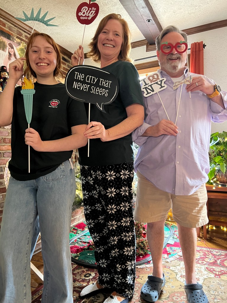 Christmas morning, reading all about our trip to New York and taking pictures with props and t-shirts! I also loved giving my daughters my year-long project with Storyworth– a book of memories and family stories written throughout the year and published into a book.