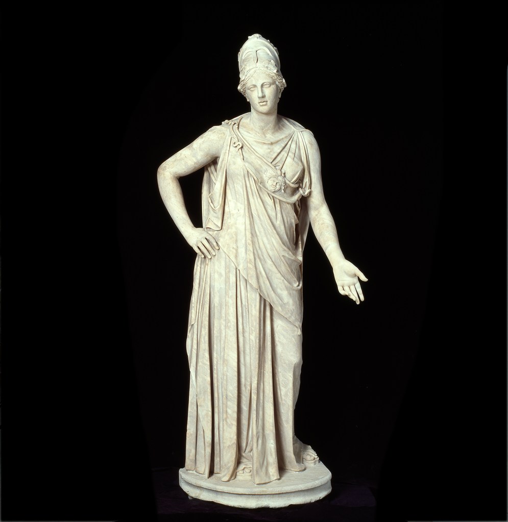 On the opposite side of Venus de Milo is the Greek god of wisdom, Athena.