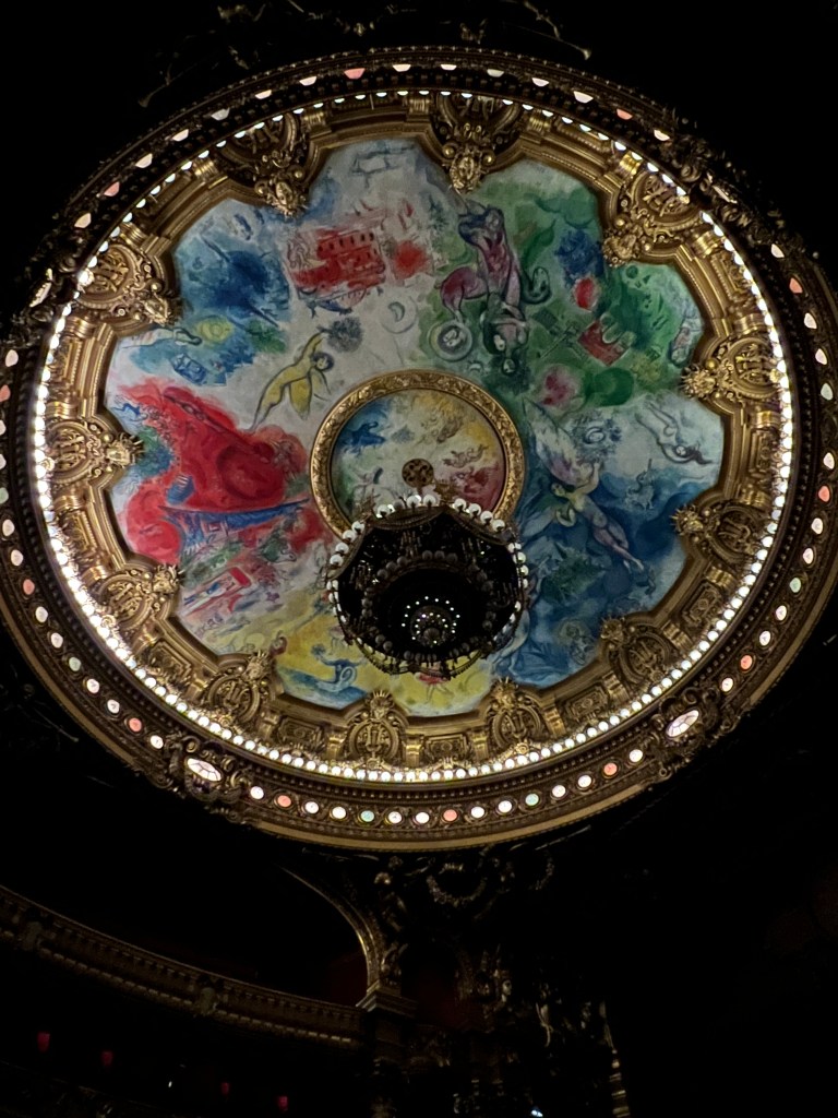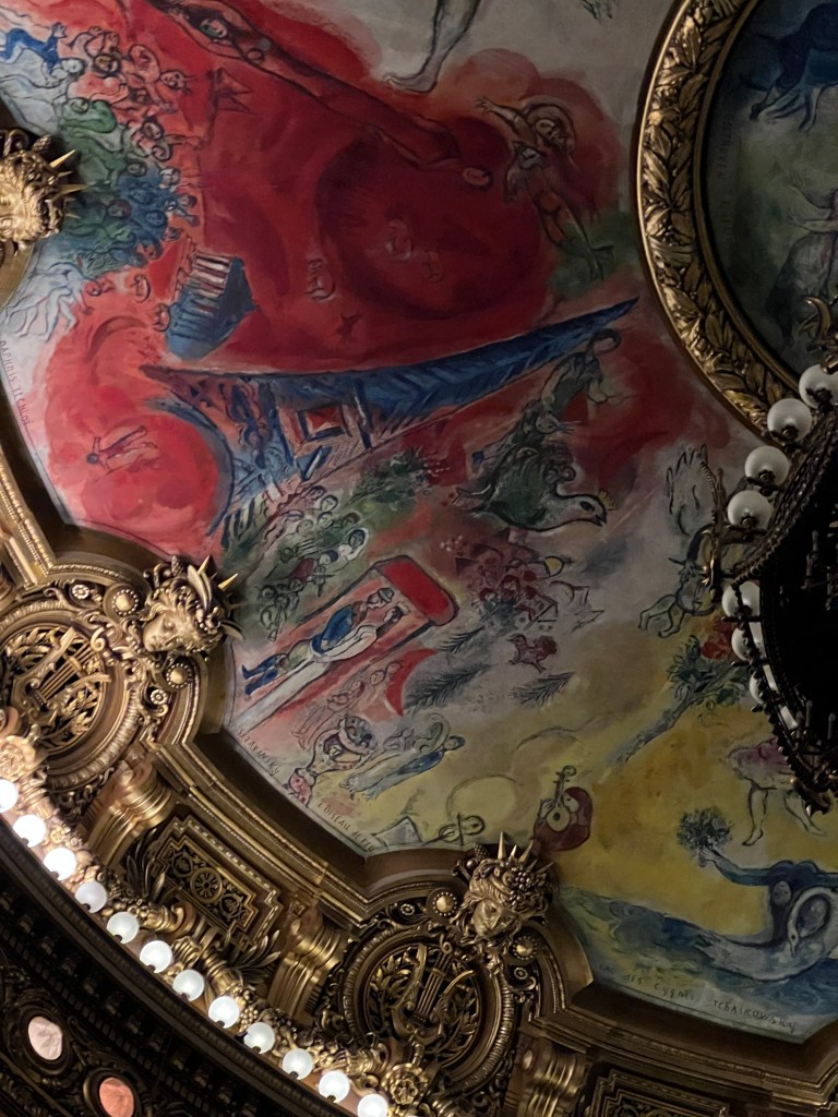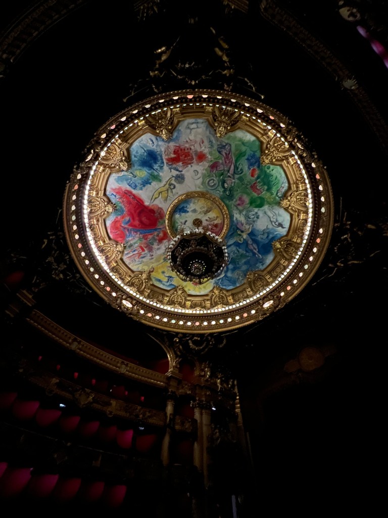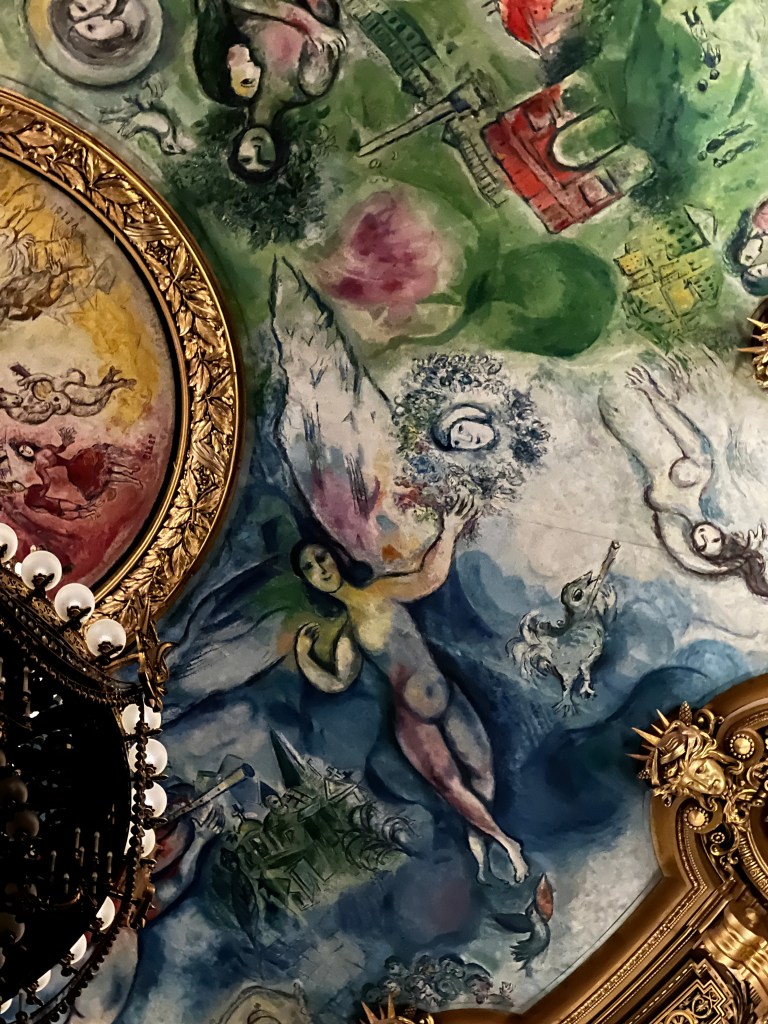 - Ceiling by Marc Chagall: One of the most striking features in the auditorium is the colorful ceiling painted by Marc Chagall in 1964. His modern artwork contrasts with the opulent golden chandelier and 19th-century decor, creating a unique blend of old and new. When you look at my pictures, take notice of how he painted the Eiffel Tower.