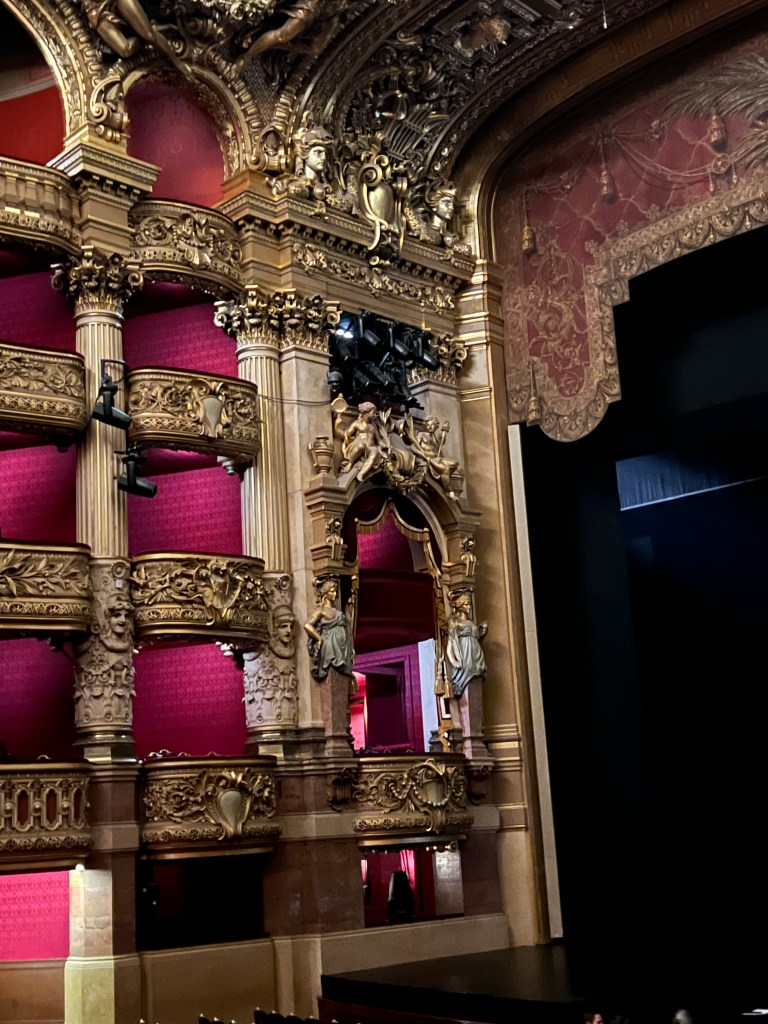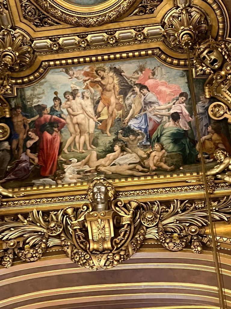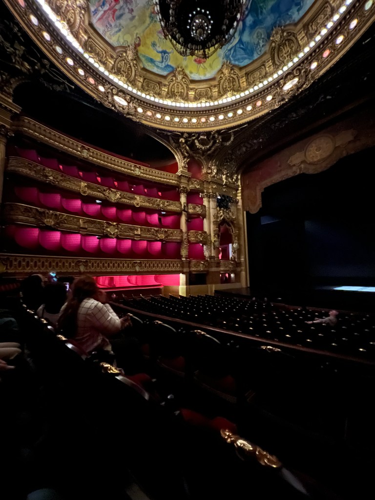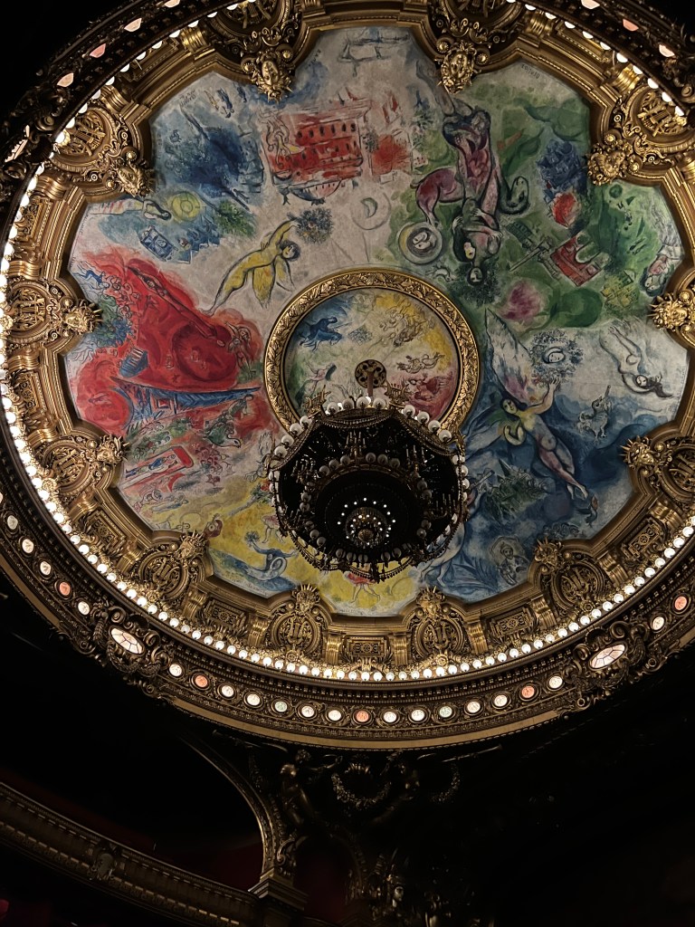 - Ceiling by Marc Chagall: One of the most striking features in the auditorium is the colorful ceiling painted by Marc Chagall in 1964. His modern artwork contrasts with the opulent golden chandelier and 19th-century decor, creating a unique blend of old and new. When you look at my pictures, take notice of how he painted the Eiffel Tower.