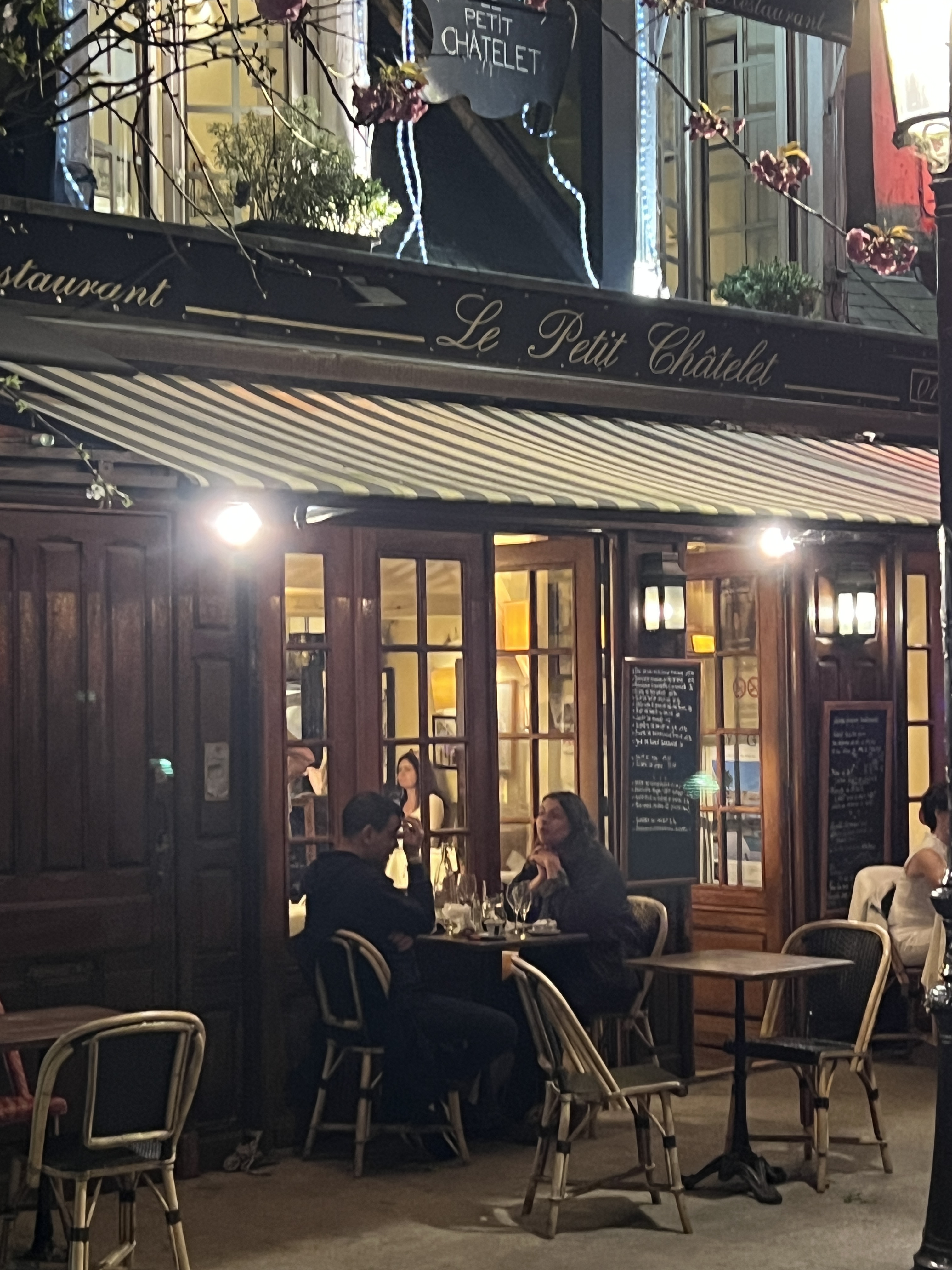 Le Petit Châtelet is a charming, family-run restaurant in Paris, located near Notre-Dame Cathedral and the Shakespeare & Company bookstore. The building itself dates back to the 16th century, while the street it sits on has roots in the 13th century. This historic setting adds to the restaurant’s warm and inviting ambiance, featuring wood-burning fireplaces, rustic wooden decor, and a traditional Parisian exterior with a slanted roof and striped awning.