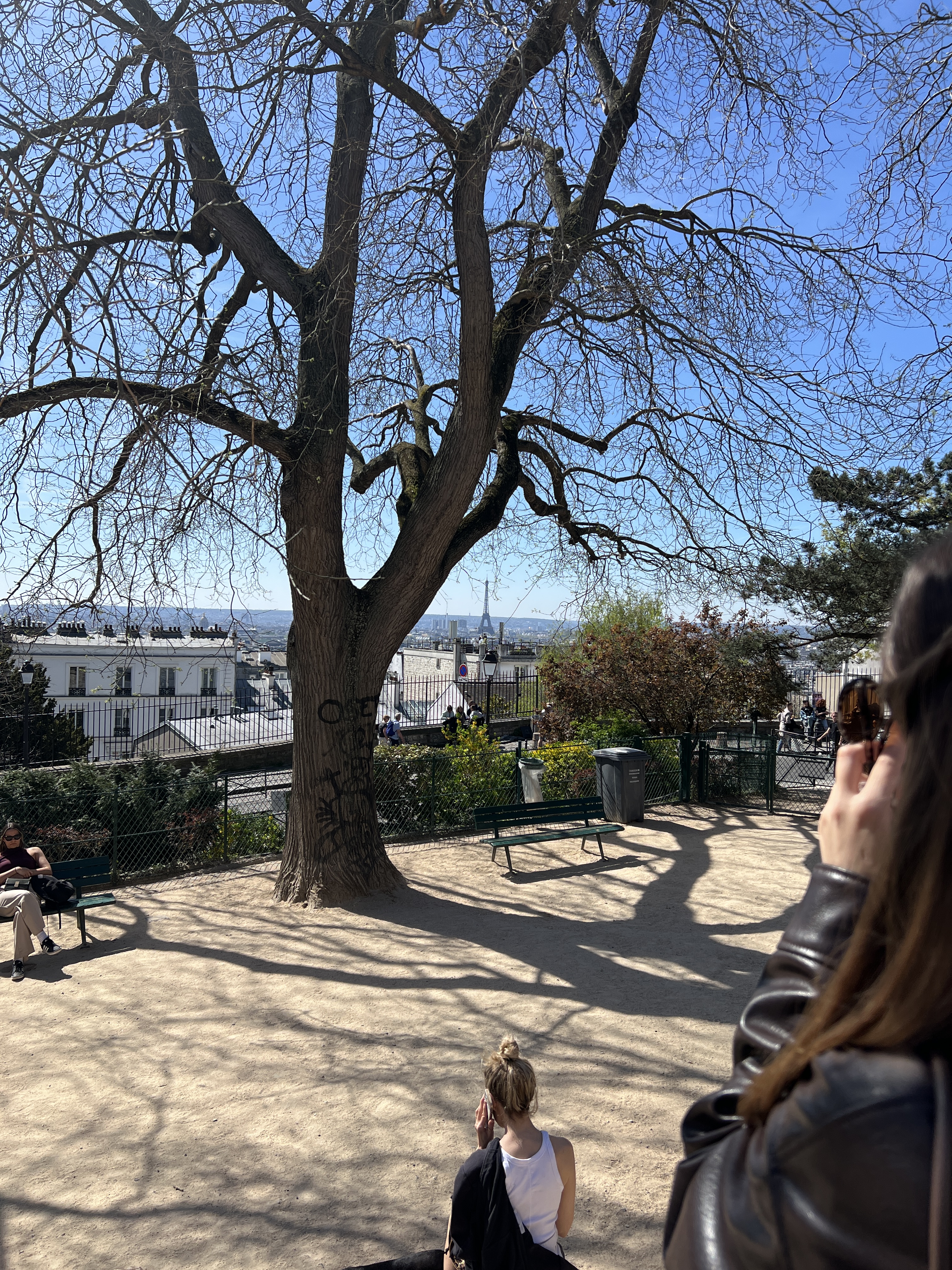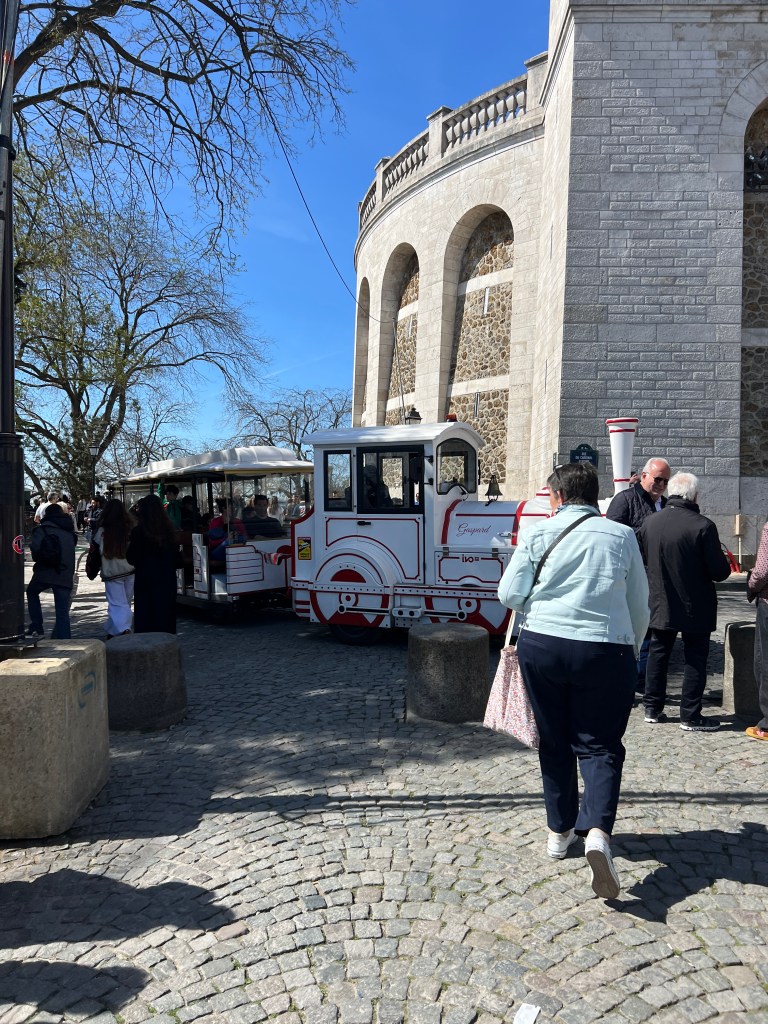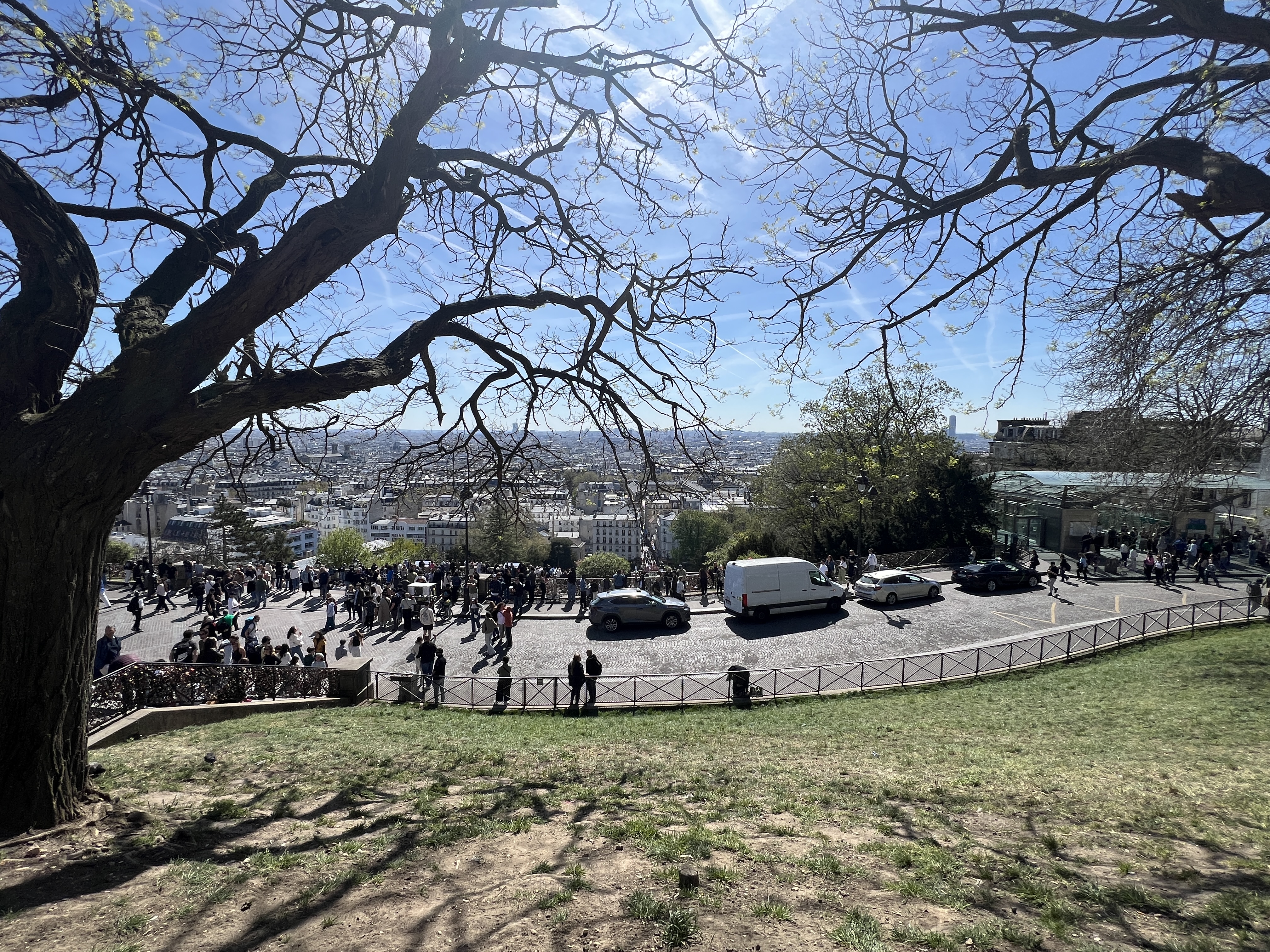 From the top of the hill, you can climb down into the city, and along the way, you can experience a tram ride if you prefer, vendors, artists, and, at the bottom, a carousel! Do you see the Eiffel Tower in the distance? Want to ride a little train around? Look at this cute train in the middle of traffic!