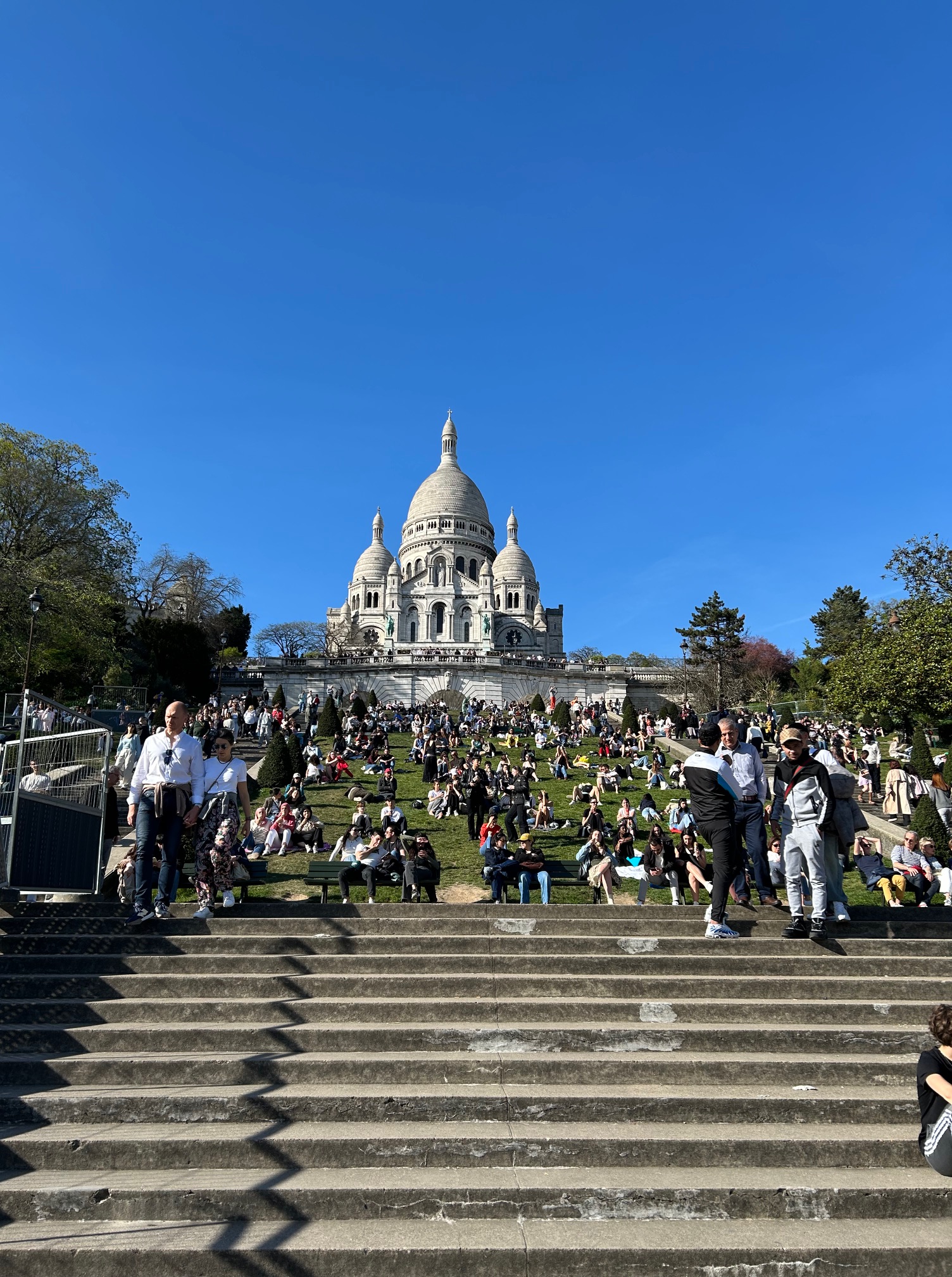 The basilica sits on a hill, and people enjoy sitting on the grass and stairs, eating, talking, and listening to entertainment!