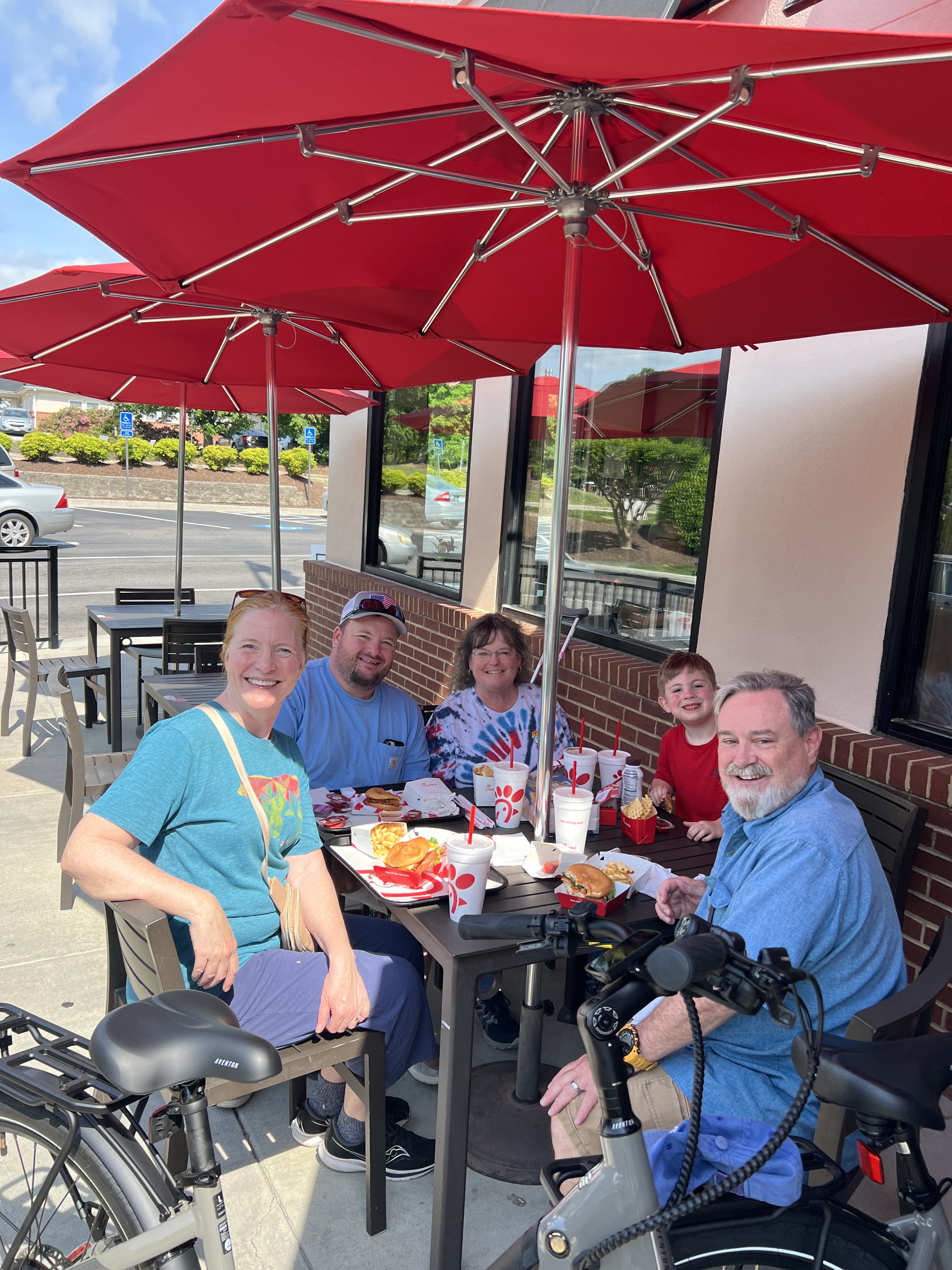 Our first adventure on the bikes was riding up to our grandson’s soccer game and lunch at our local Chick-fil-A!
