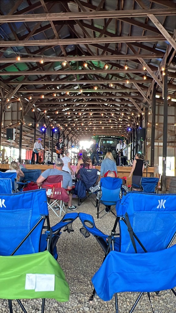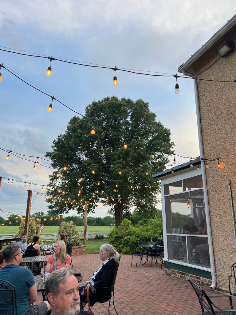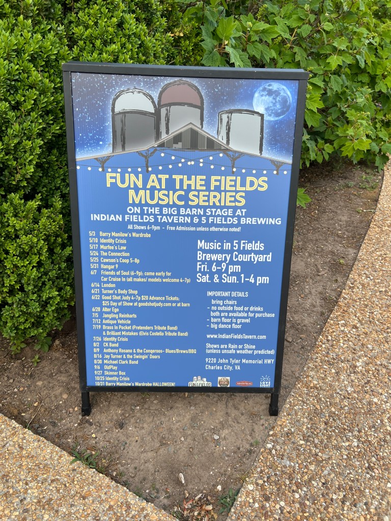 If you go to Indian Fields Tavern, take a chair for the concert, check out their website (linked above) for any details, and make a dinner reservation if you want to enjoy their beautiful historical home. We used bungees to tie the chairs to our bike rack. The food was delicious, and we especially enjoyed the “Blue Crab Rangoon!” They are tremendous, yummy, and good to share with someone.