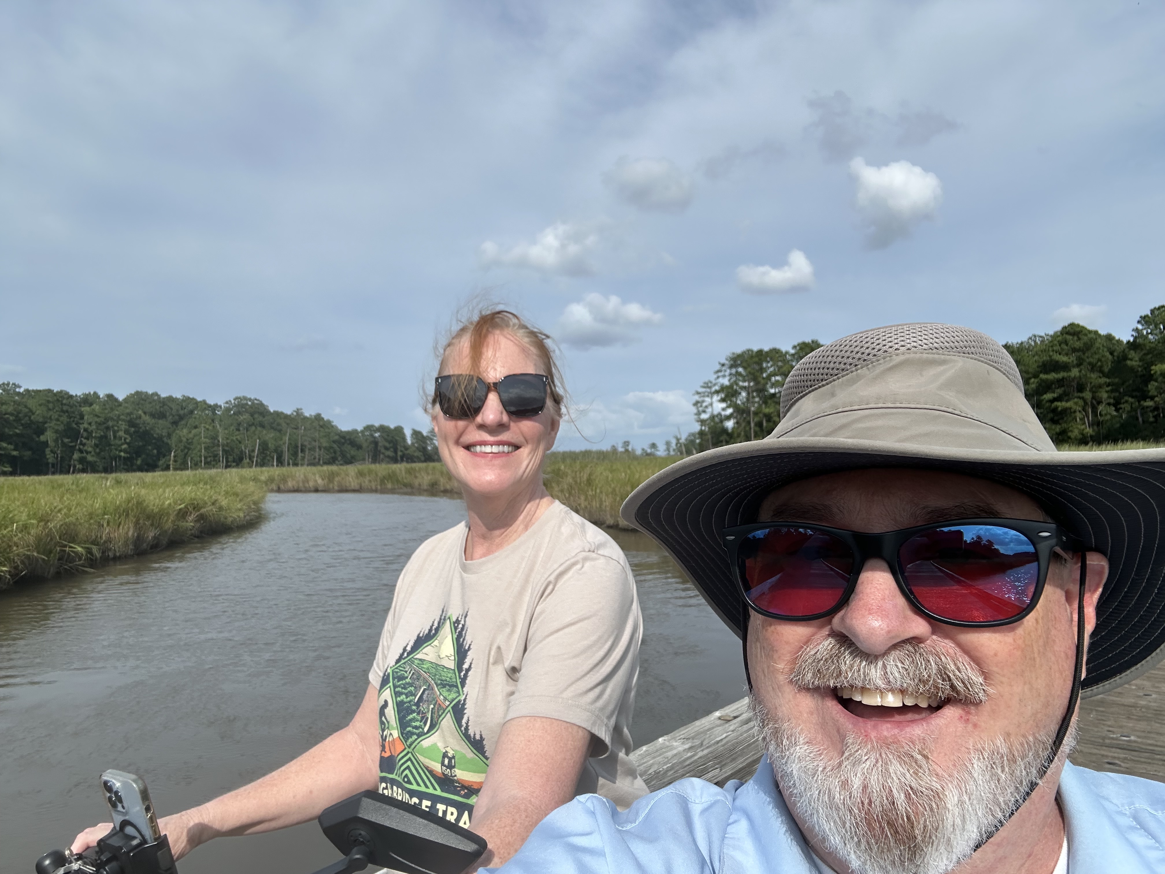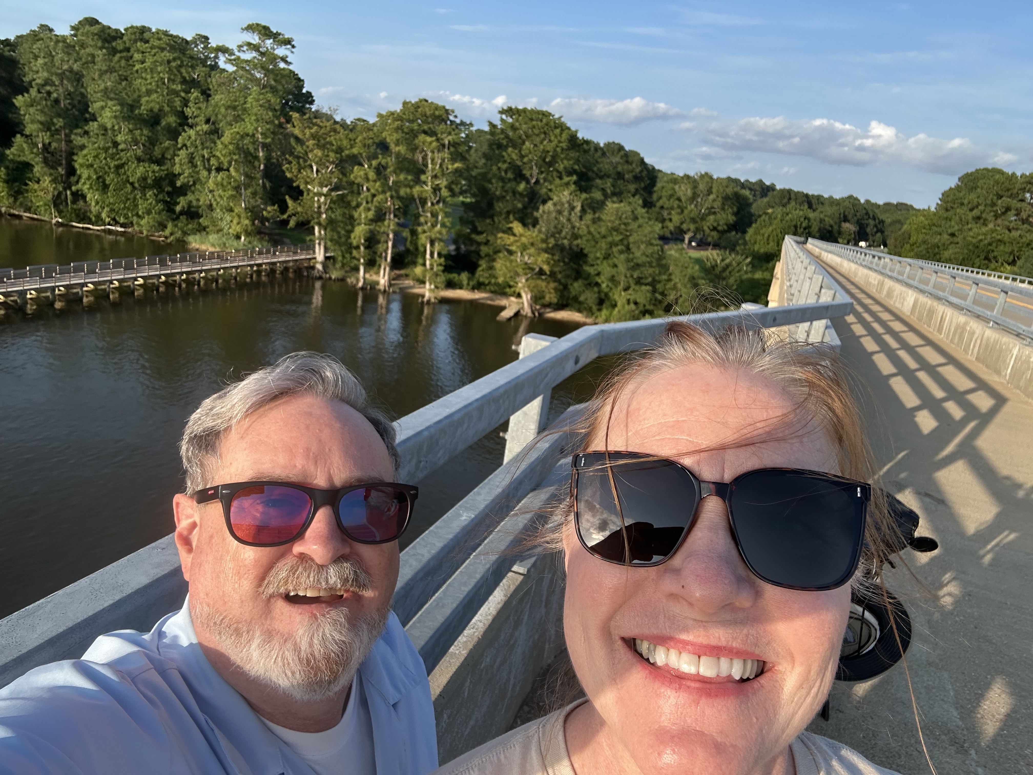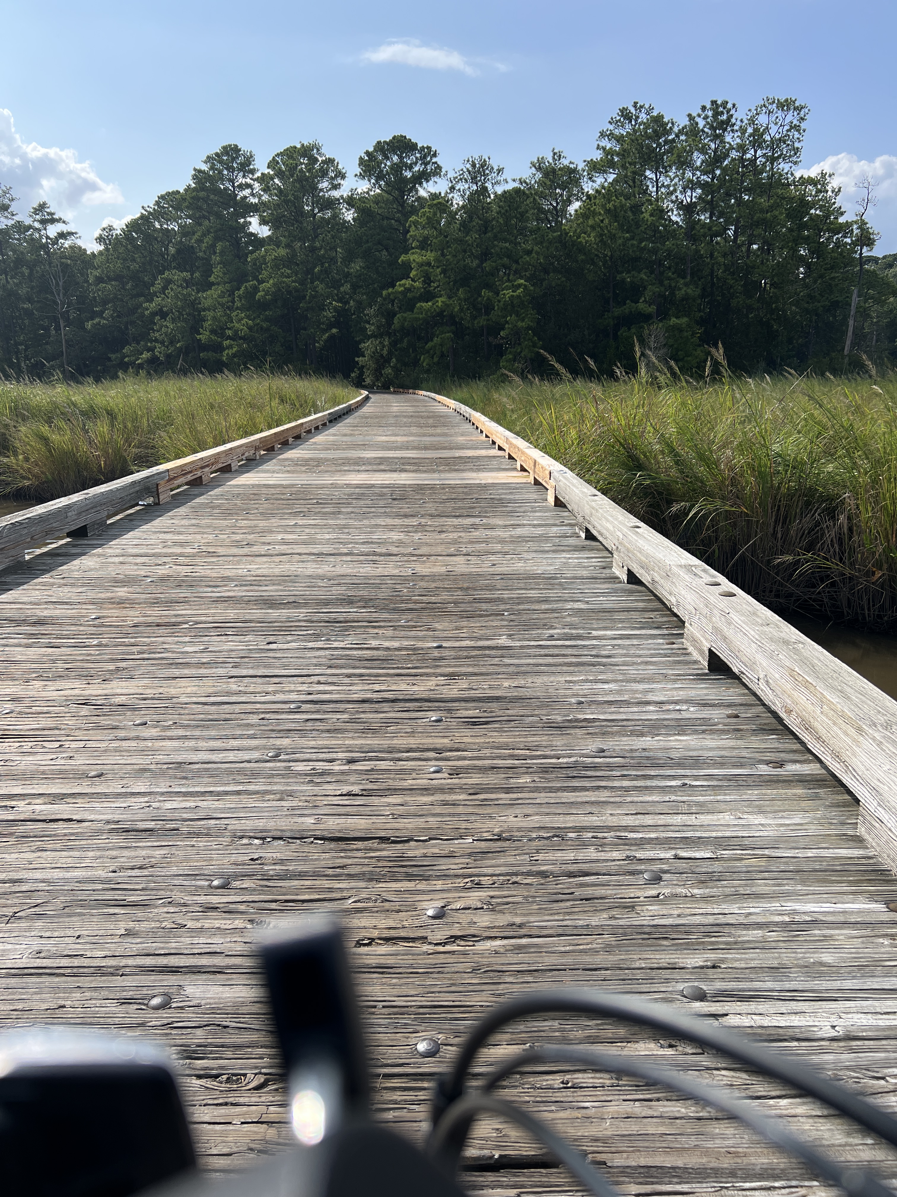 We’ve sectioned the Capital Trail to enjoy it in chunks. Today we parked our car at the Chickahominy Riverfront Park in Charles City, VA. Typical of our day, we started later than we had hoped, but we were able to head out by 1:30. With an hour drive there, we enjoyed the scenery along the way, and the weather was good! We were thankful for no rain! The park has restrooms and ample parking. We rode our bikes to check out the campground and noticed they had “glamping tents” available. They also have a pool with a lifeguard on duty.